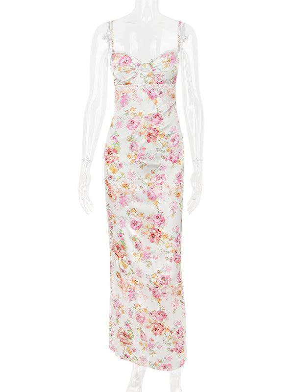 Beige Floral Back Slit Backless Baby Shower Maternity Maxi Dress