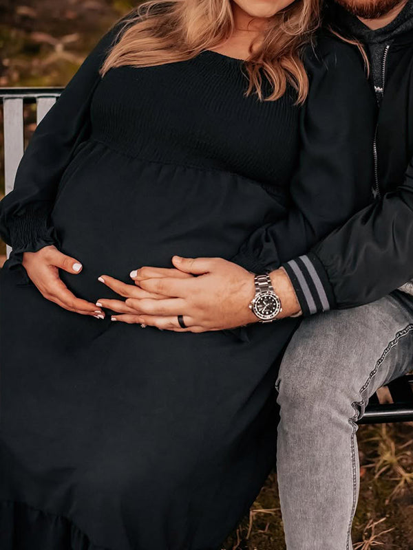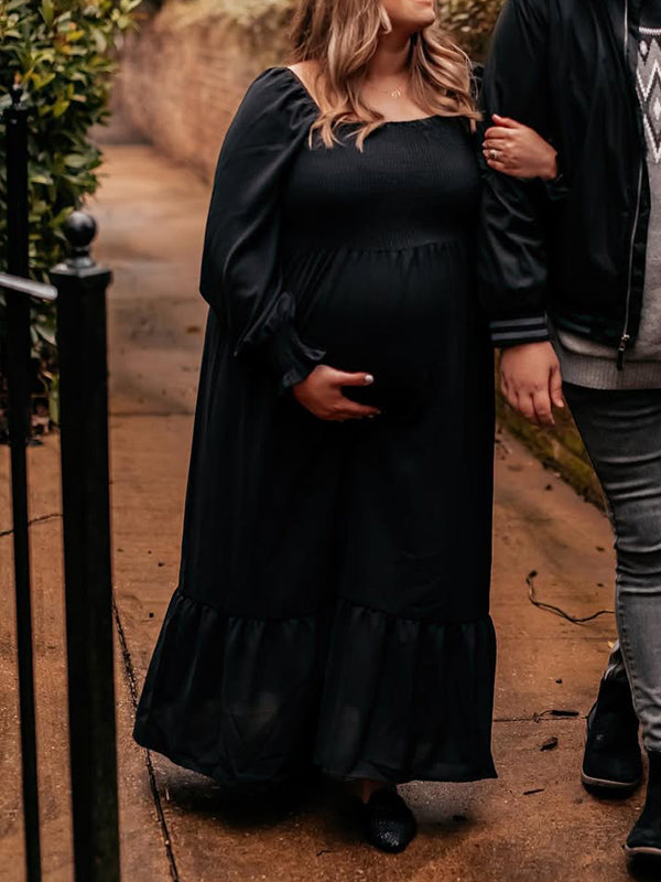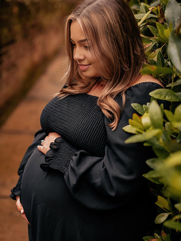 Black Smocked Falbala High Waisted Maternity Photoshoot Maxi Dress