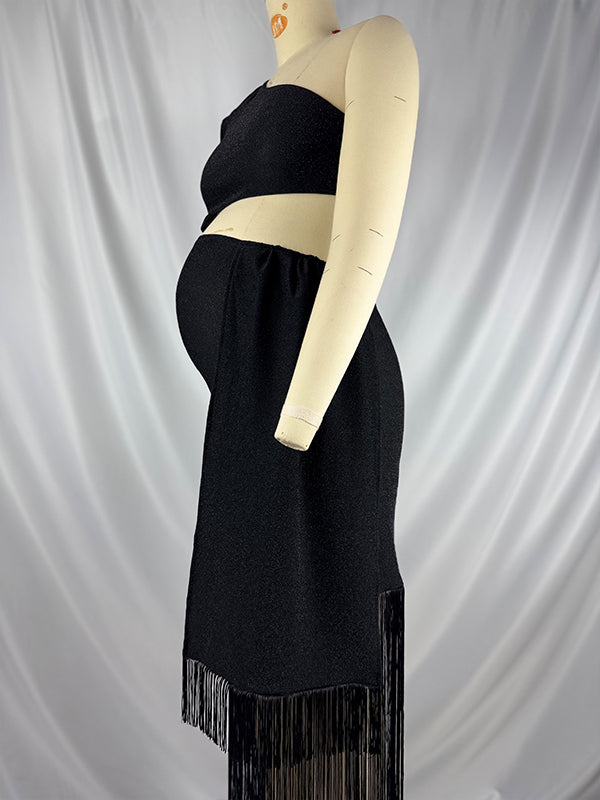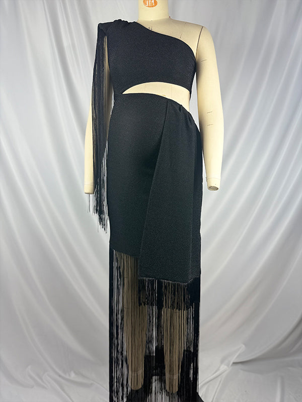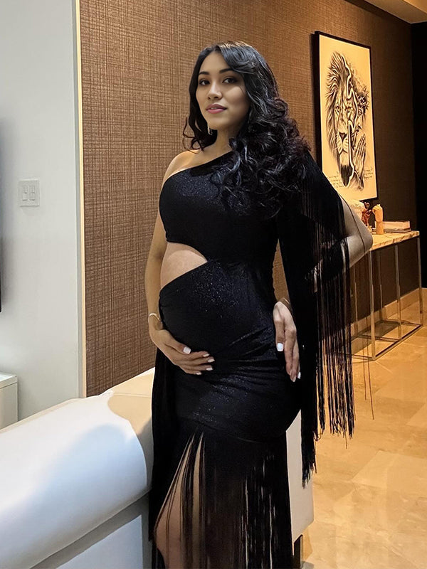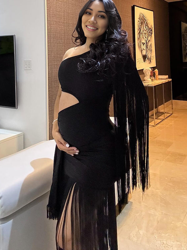 Black Tassel One Shoulder Cut Out Maternity Party Maxi Dress