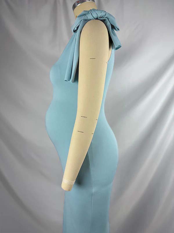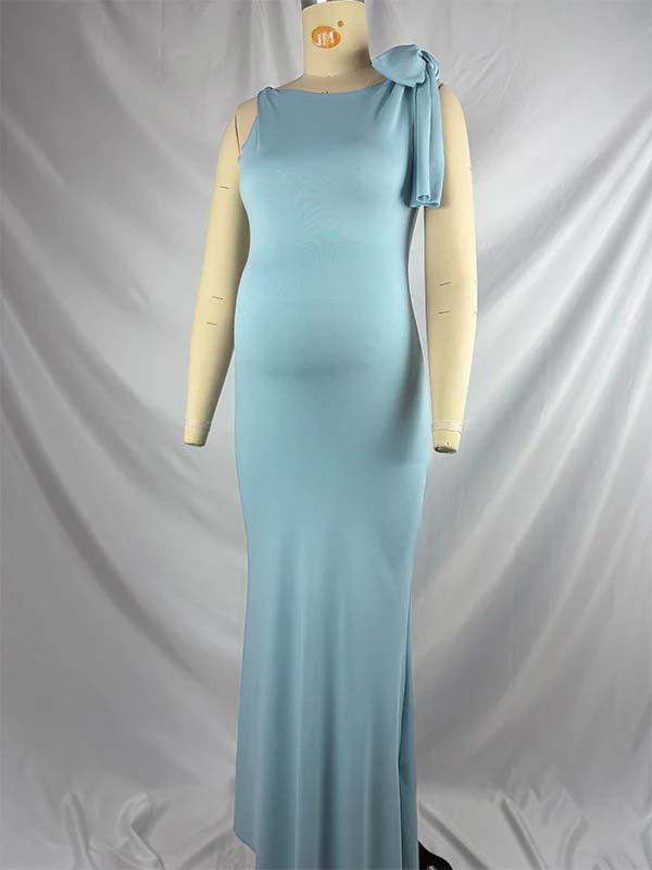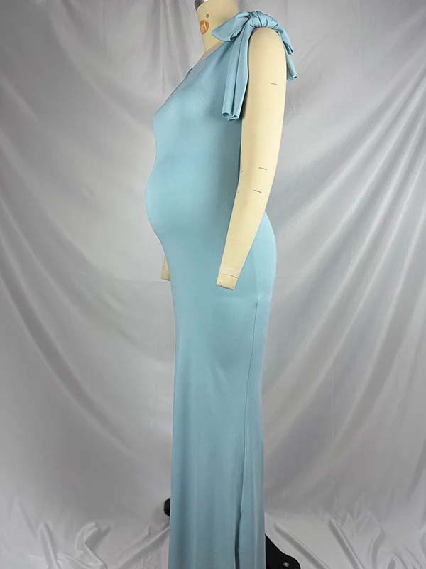 Blue Bowknot One Shoulder Elegant Maternity Baby Shower Maxi Dress