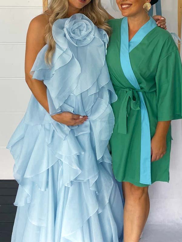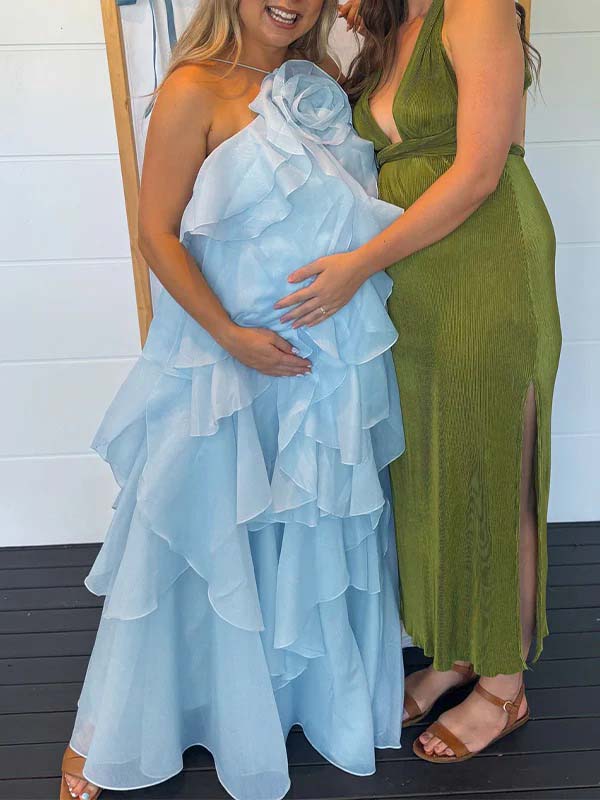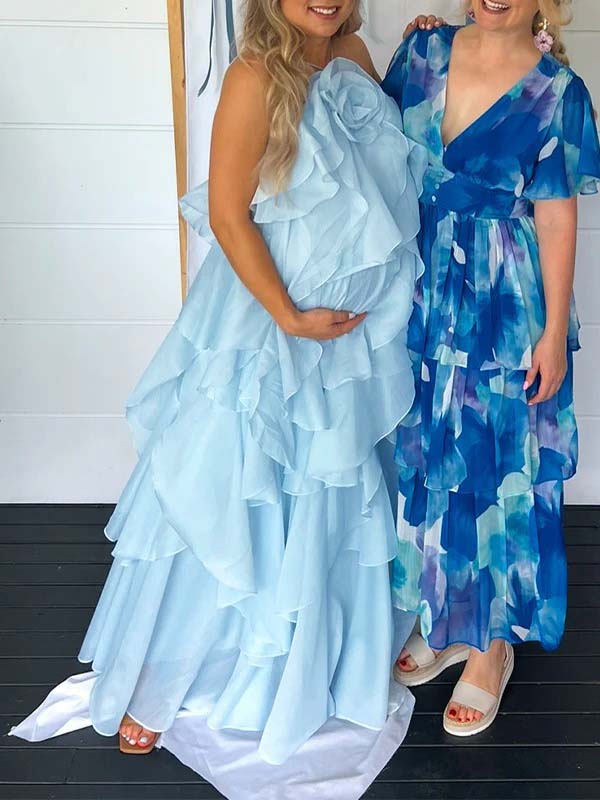 Blue Cake Ruffle 3D Flower Backless Baby Shower Maternity Maxi Dress