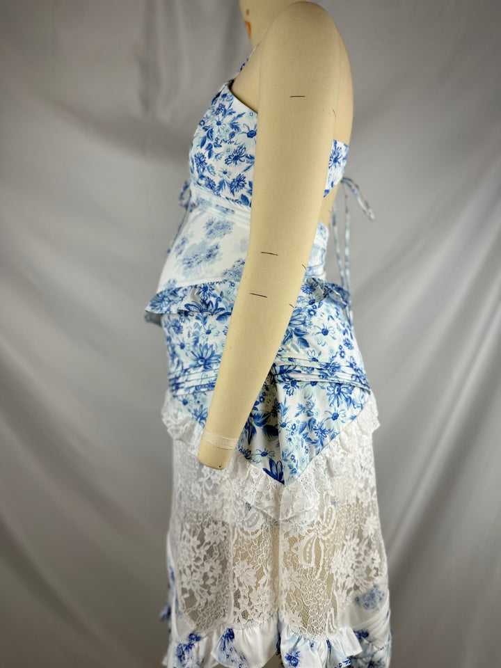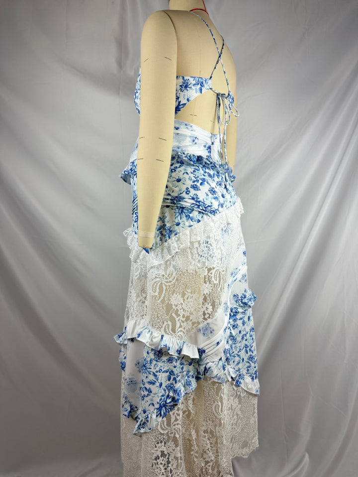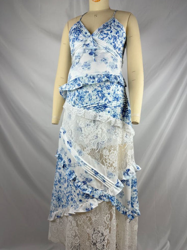 Blue Spaghetti Strap Strap Stamp Lace Falbala Maternity Baby Shower Maxi Dress