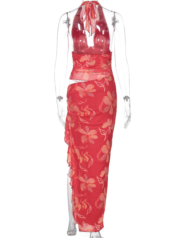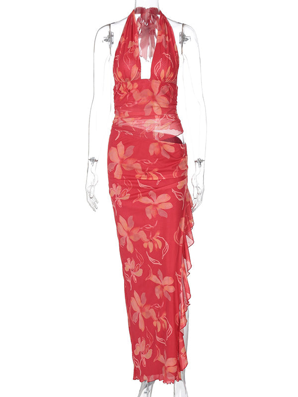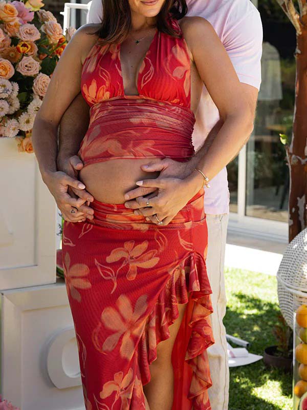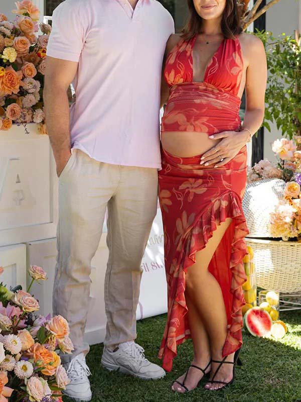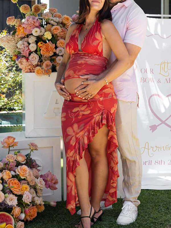 Floral Crop Ruffle Side Slit Backless 2-in-1 Chic Maternity Maxi Dress