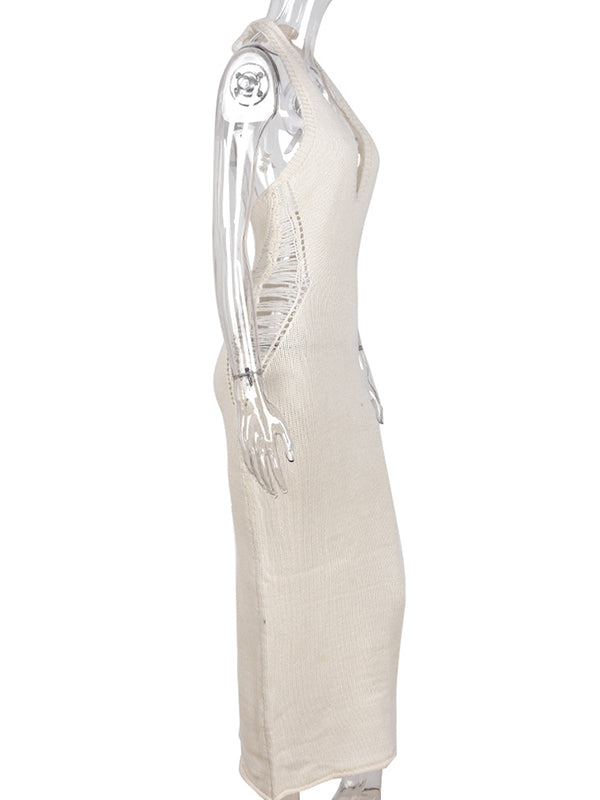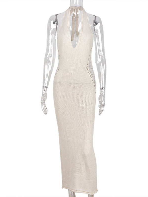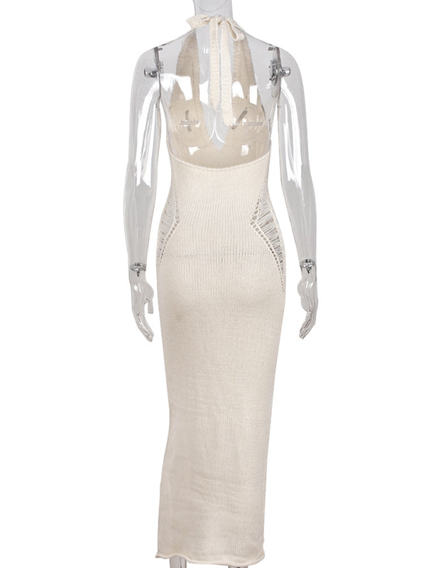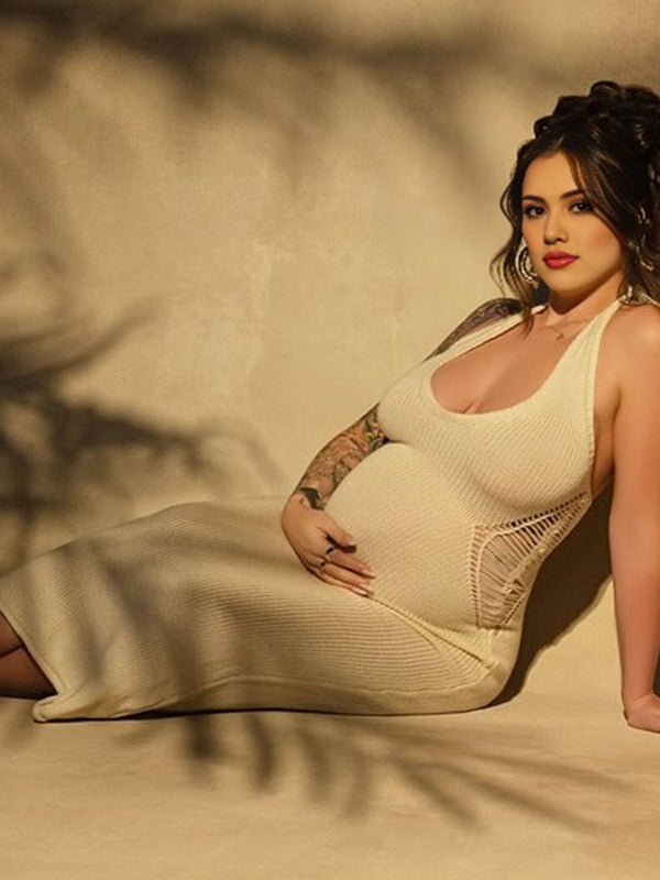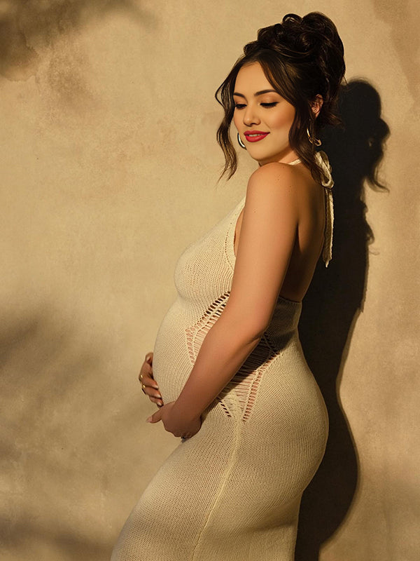 fotobeyou Apricot Crochet Hollow Out Halter Neck Backless Bodycon Chic Baby Moon Beach Maternity Photoshoot Baby Shower Maxi Dress