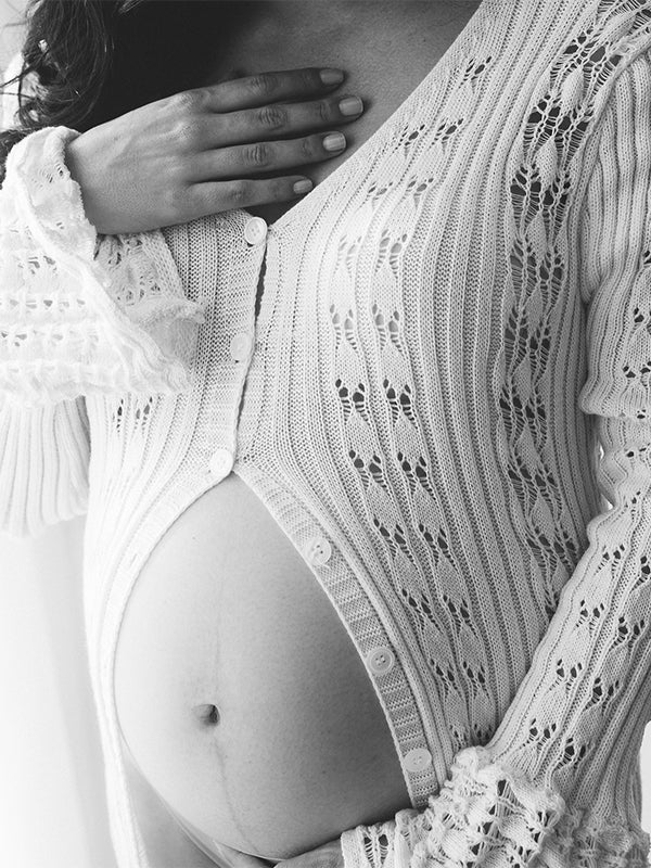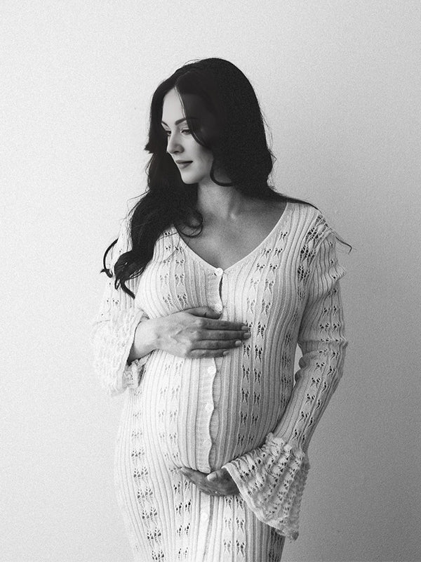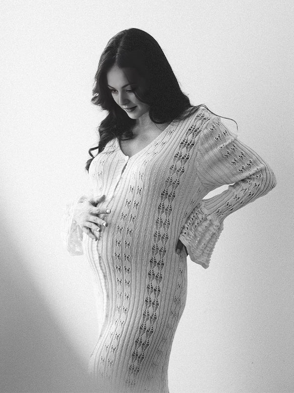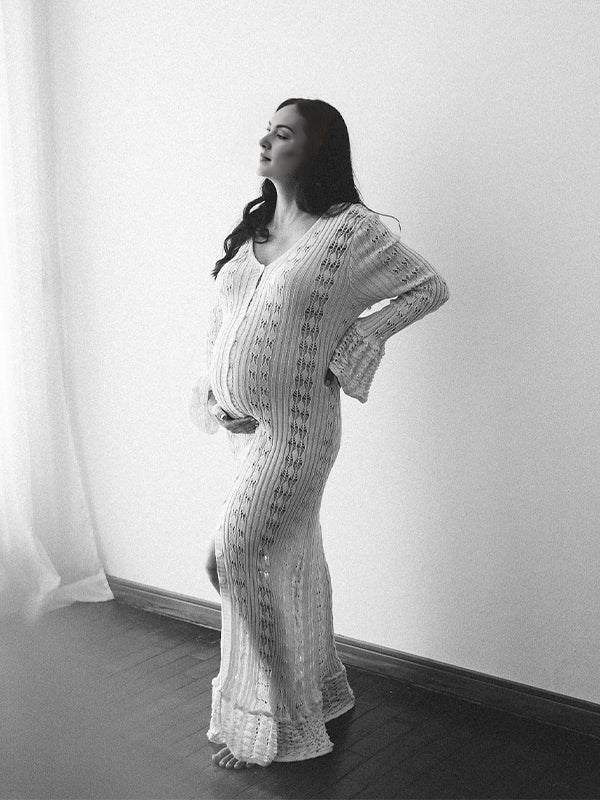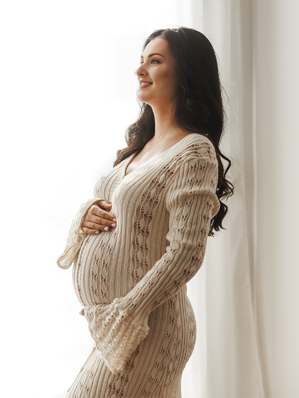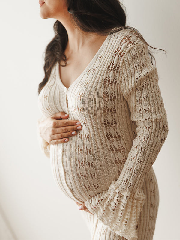 fotobeyou Apricot Cut Out Knit Flare Sleeve Buttons Cardigan Photoshoot Fall Maternity Maxi Dress