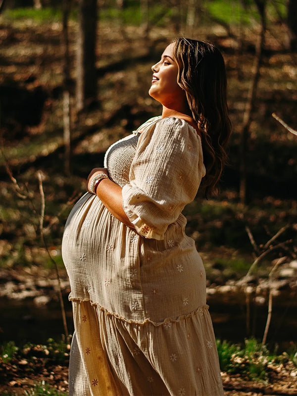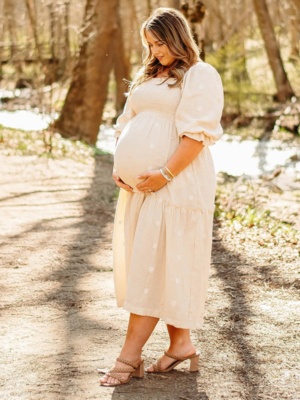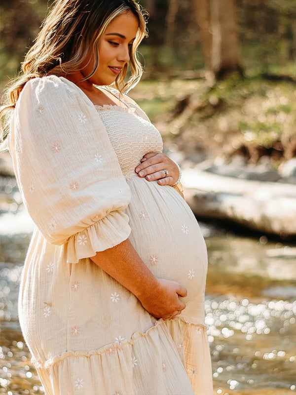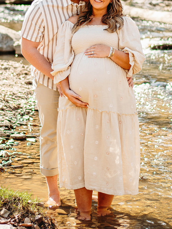 fotobeyou Apricot Daisy Print Smocked Off Shoulder Maternity Photoshoot Maxi Dress