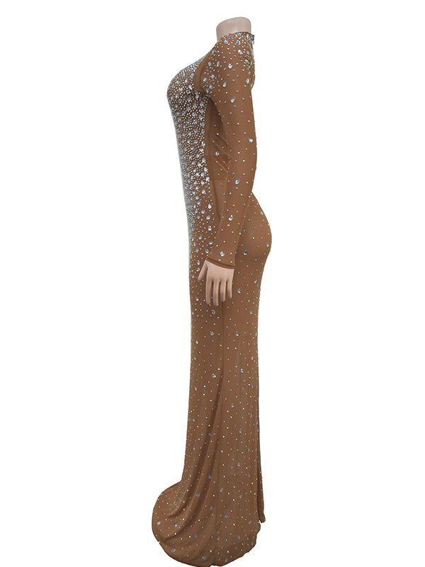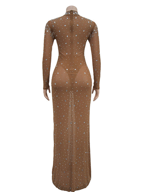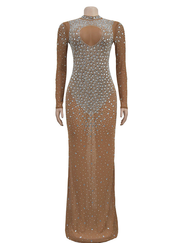 fotobeyou Apricot Glitter Diamonds Rhinestone Mesh Back Slit Bodycon Elegant Cocktail Sheer Maternity Photoshoot Maxi Dress
