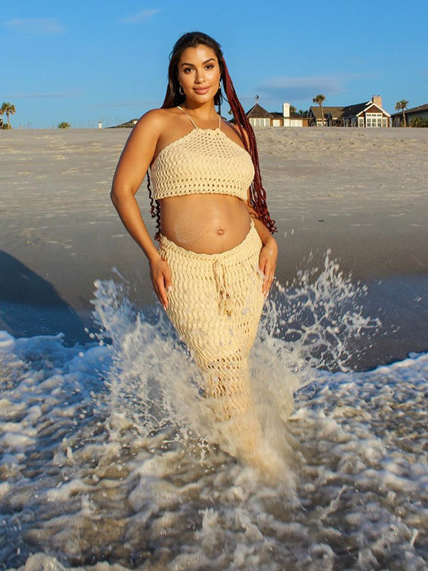 fotobeyou Apricot Halter Neck Back Lace-up Tassel 2-in-1 Drawstring Crochet Crop Vacation Maternity Maxi Dress