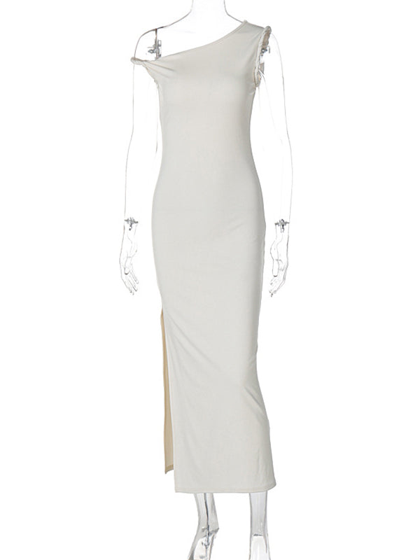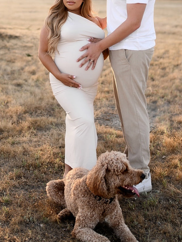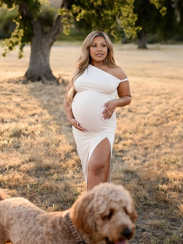 fotobeyou Apricot Irregular Side Slit Asymmetric Shoulder Bodycon Elegant Babyshower Dress Photoshoot Maternity Maxi Dress