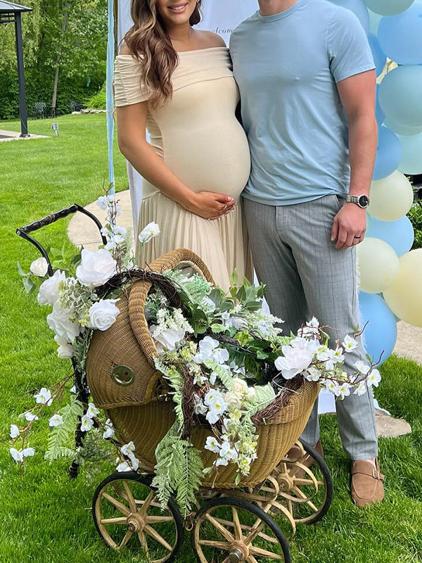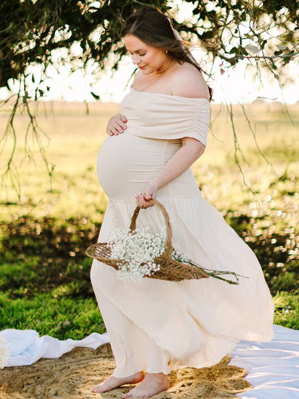 fotobeyou Apricot Off Shoulder Ruched Pleated Big Swing Maternity Baby Shower Maxi Dress