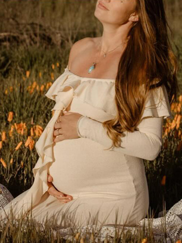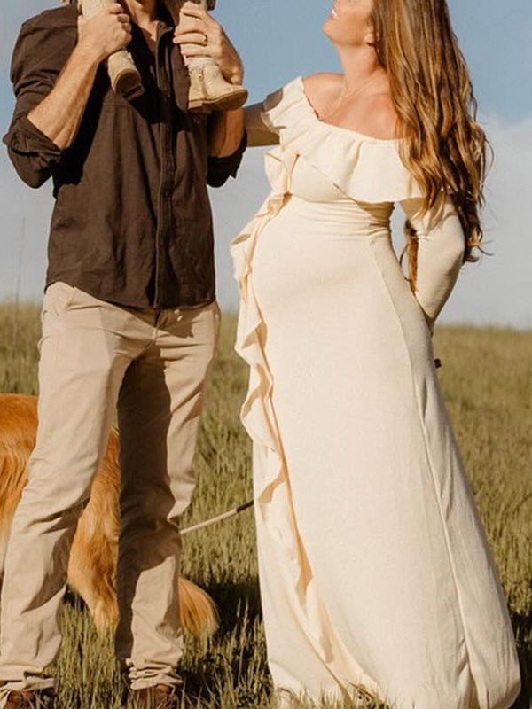 fotobeyou Apricot Off Shoulder Side Slit Ruffle Falbala Draped Elegant Going Out Maternity Photoshoot Baby Shower Maxi Dress