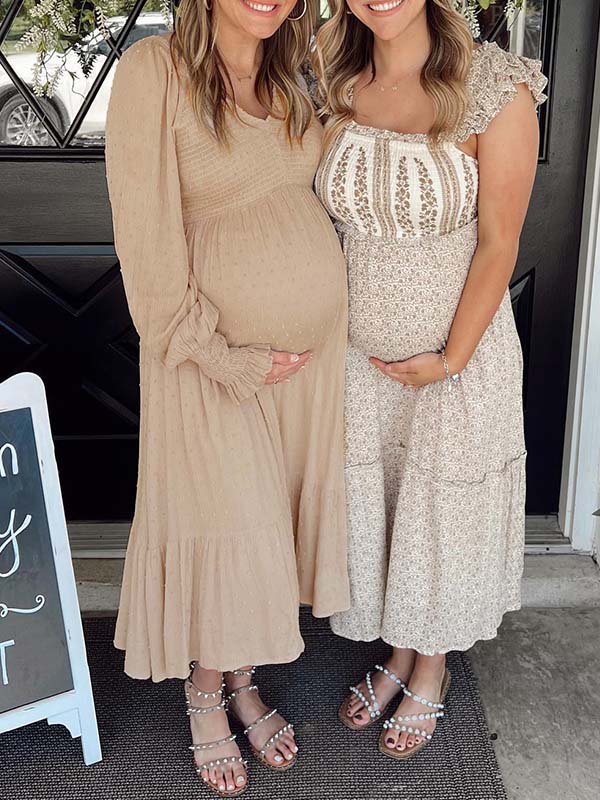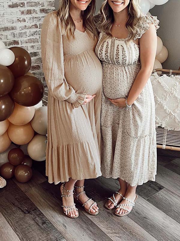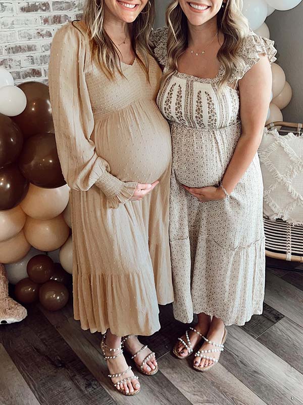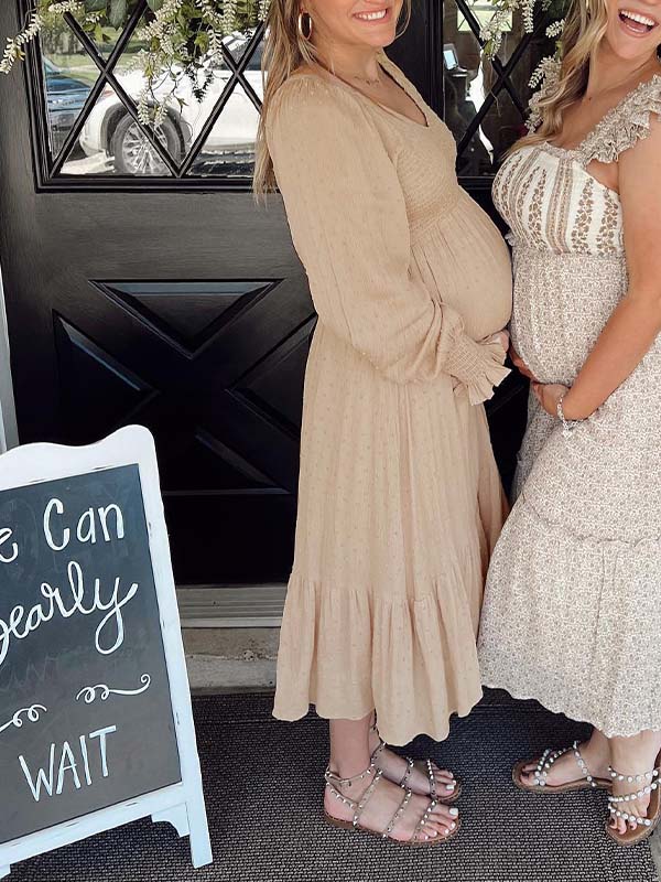 fotobeyou Apricot Smocked Flouncy V neck Daily Going out Baby Shower Maternity Photoshoot Midi Dress