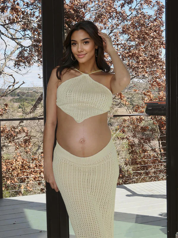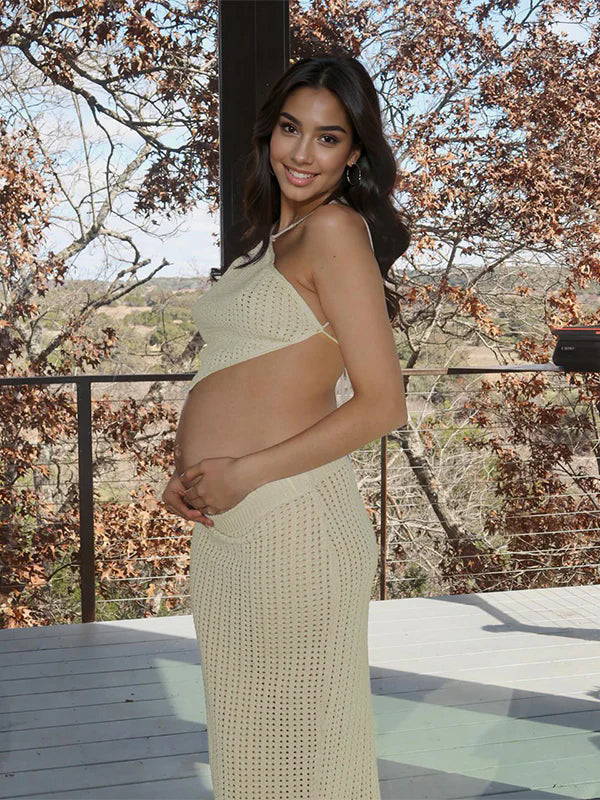fotobeyou Beige 2 Piece Halter Neck Crochet Fashion Beach Vacation Bodycon Maternity Maxi Dress