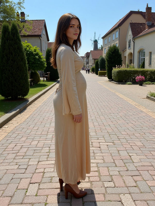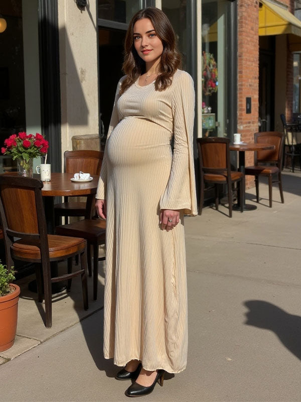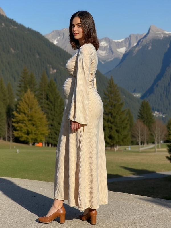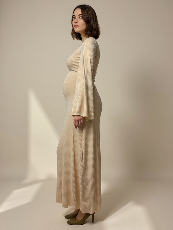 fotobeyou Beige Knit Back Tie U-neck Flare Sleeve Elegant Baby Shower Maternity Maxi Dress