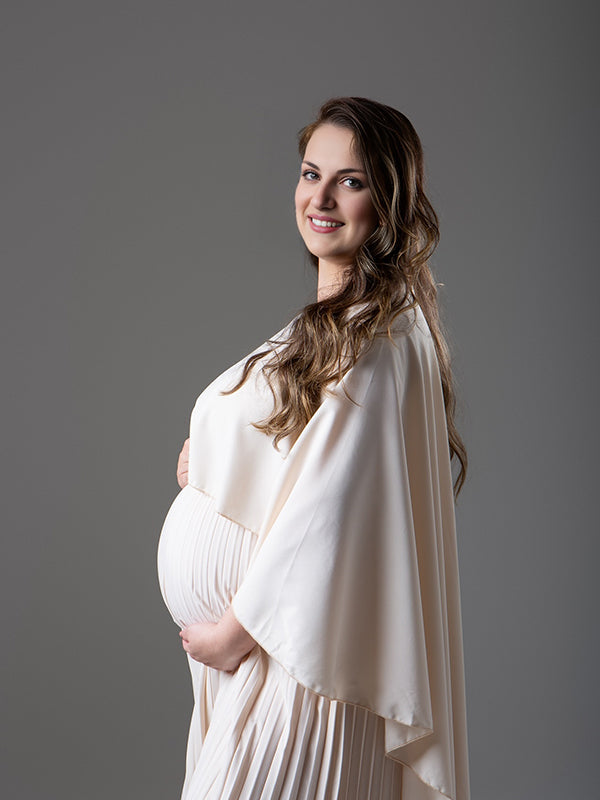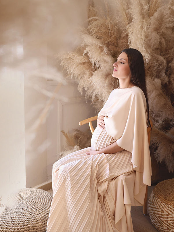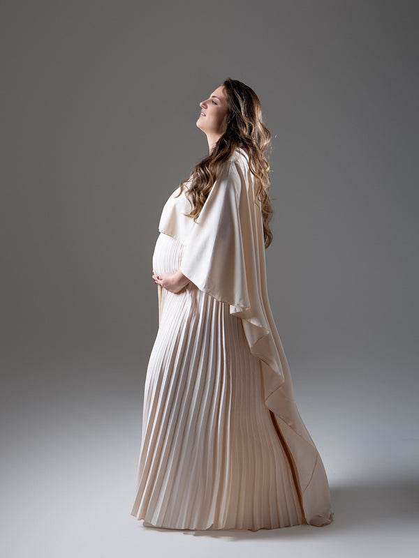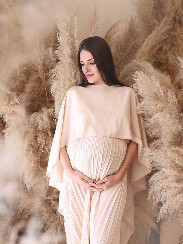 fotobeyou Beige Pleated Cloak Cape Sleeve Elegant Evening Gown Maternity Photoshoot Maxi Dress