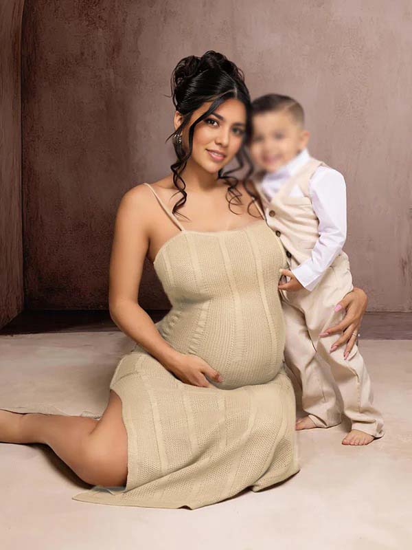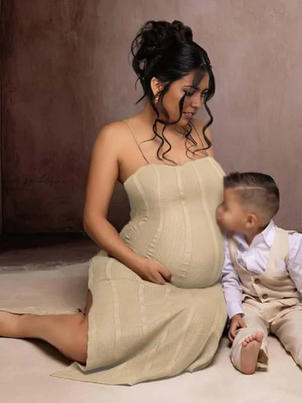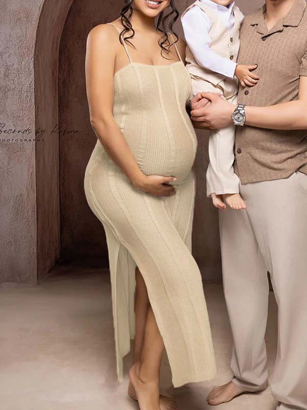 fotobeyou Beige Spaghetti Strap Striped Crochet Maternity Photoshoot Maxi Dress
