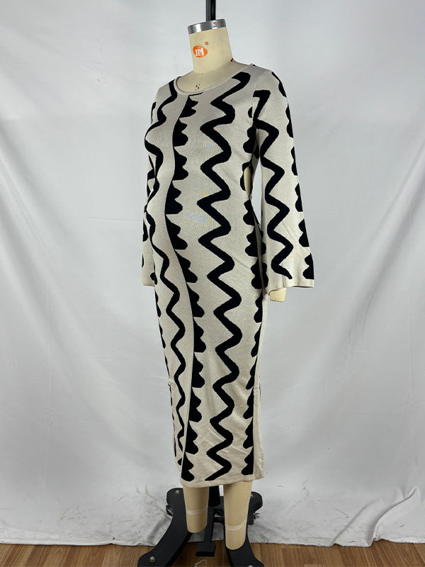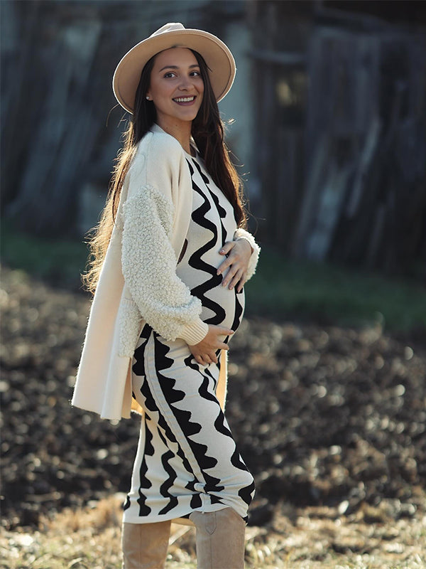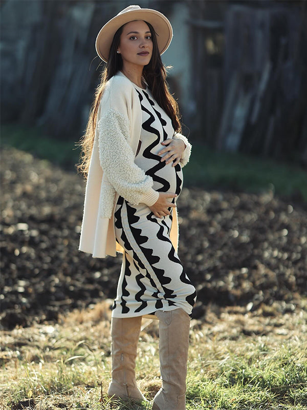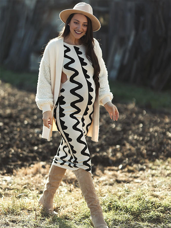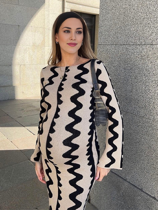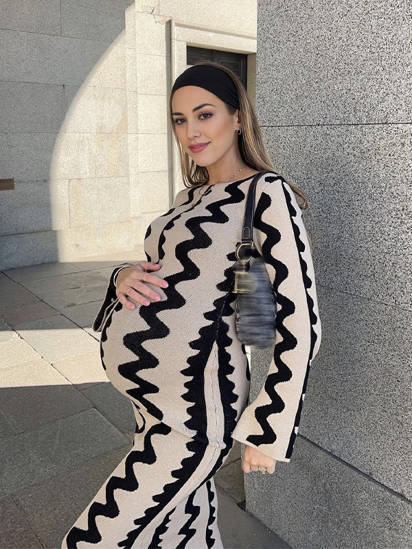 fotobeyou Beige Wavy Edge Cut Out Bodycon Elegant Photoshoot Baby Shower Maternity Maxi Sweater Dress