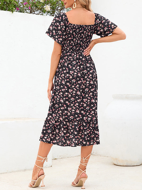 fotobeyou Black And Pink Print Flowers Square Neck Ruffle Flowy Elegant Maternity Photoshoot Midi Dress