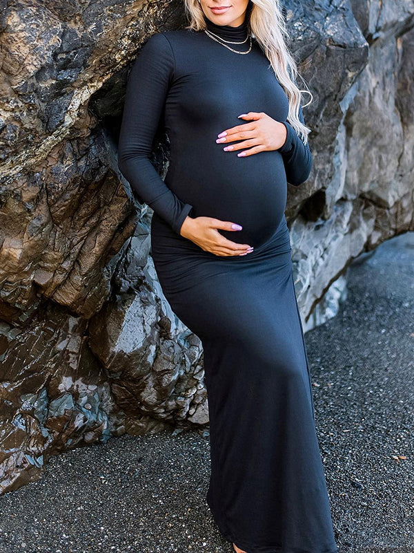 fotobeyou Black High Neck Side Slit Bodycon Long Sleeve Baby Shower Maternity Maxi Dress