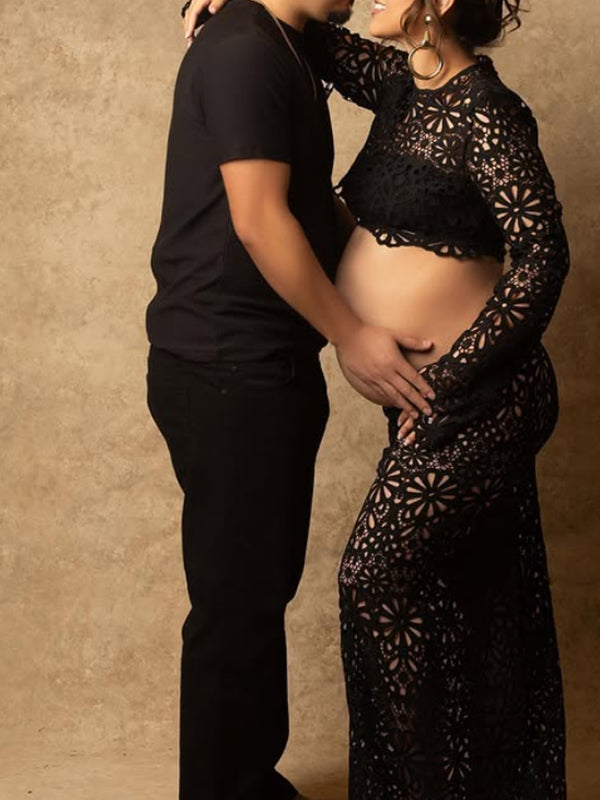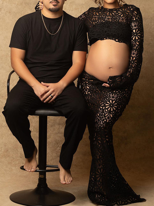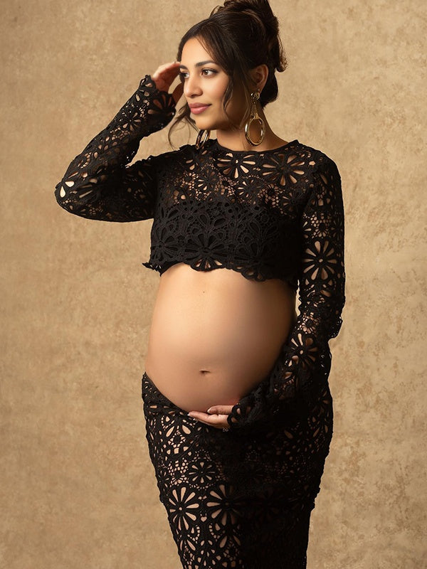 fotobeyou Black Lace Skeleton Two Piece Bodycon Beach Vacation Baby Shower Maternity Photoshoot Suits