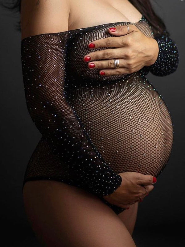 fotobeyou Black Off Shoulder Maternity Photoshoot Body Rhinestones Crystal Bodysuit