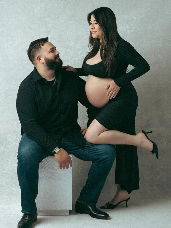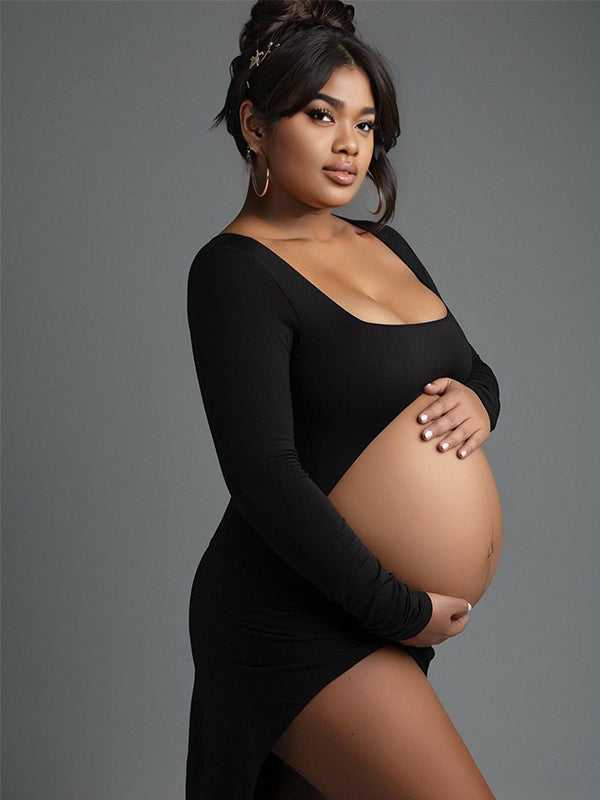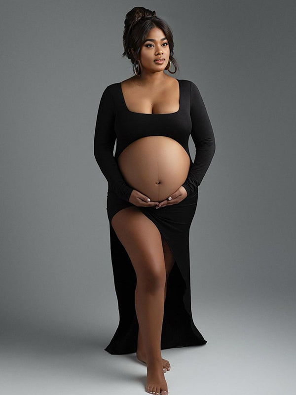 fotobeyou Black Ruffle Cut Out Crop Side Slit Irregular Bodycon Photoshoot Maternity Maxi Dress