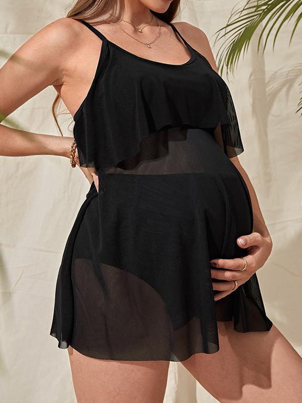 fotobeyou Black Two Piece Chiffon Ruffle Sheer Cami Bathing Suits Beach Pool Bikin Chic Maternity Baby Moon Swimwear