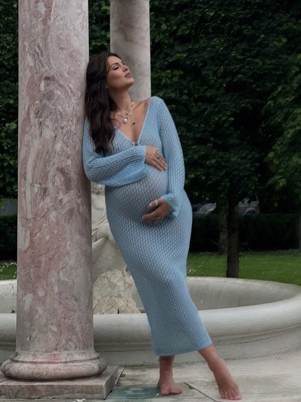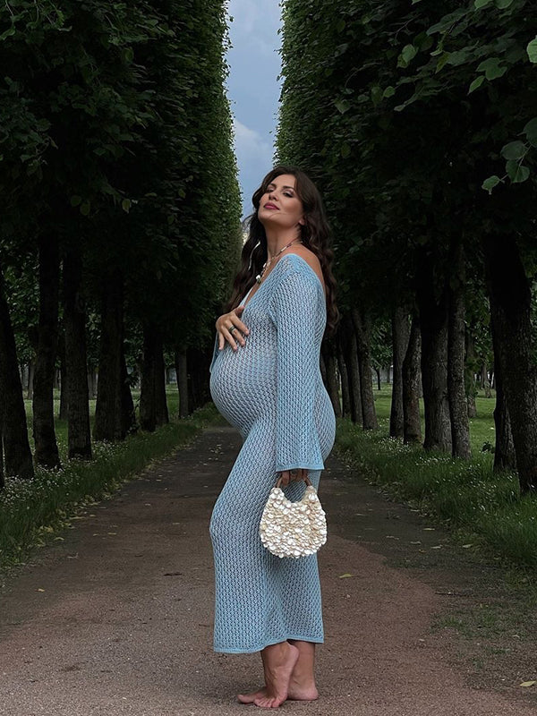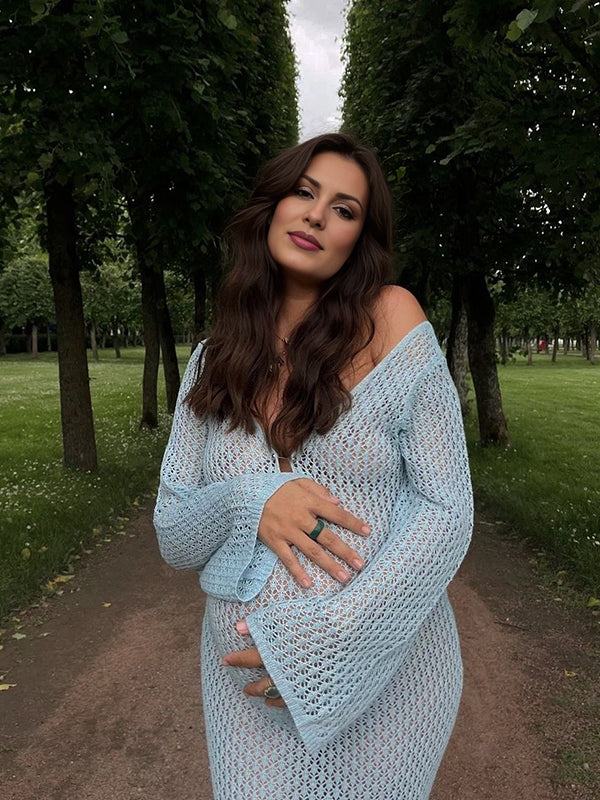 fotobeyou Blue Crochet Hollow Out Backless Deep V-neck Flare Sleeve Elegant Baby Moon Beach Cover Up Photoshoot Baby Shower Maxi Dress