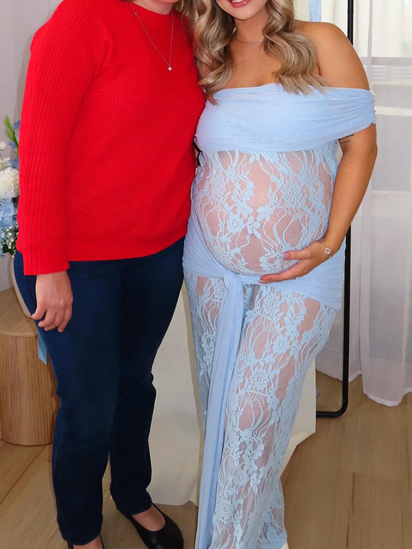 Fotobeyou Blue Lace Mesh Off Shoulder Knot Ruched Draped Sheer Maternity Maxi Dress