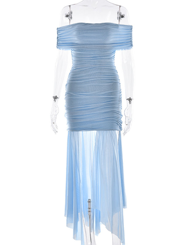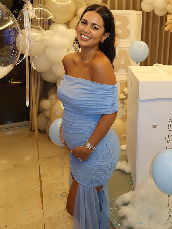 fotobeyou Blue Mesh Ruched Off Shoulder Side Slit Maternity Maxi Dress