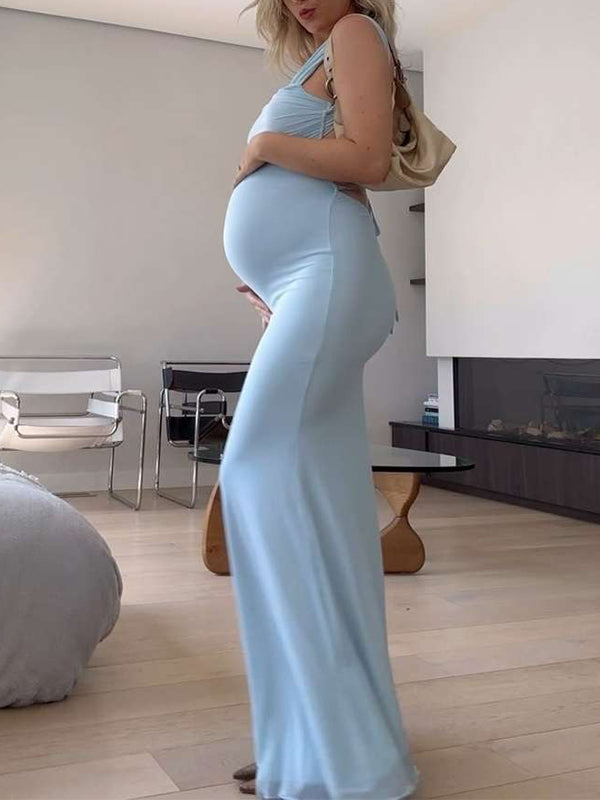 fotobeyou Blue Tank Backless Lace Up Tie Back Sleeveless Cami Mermaid Maternity Maxi Dress