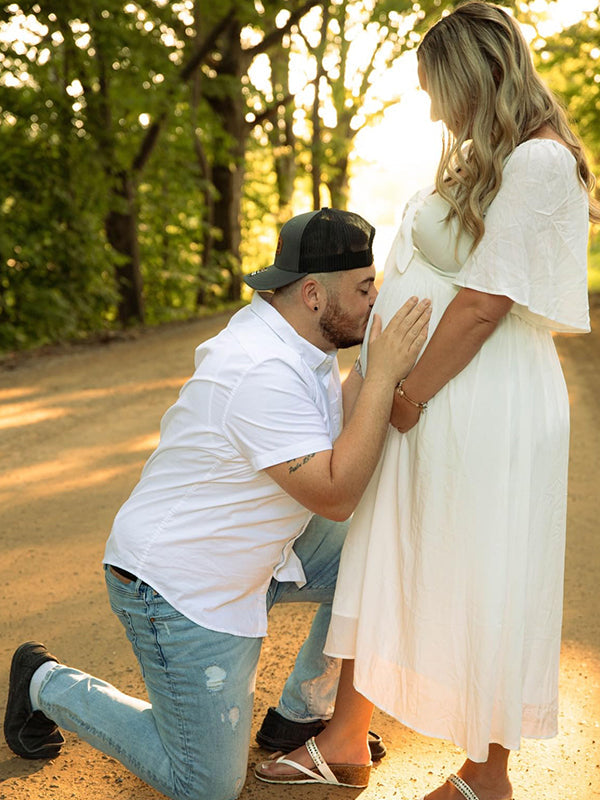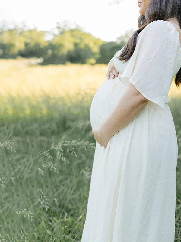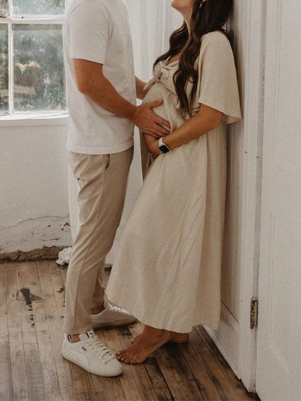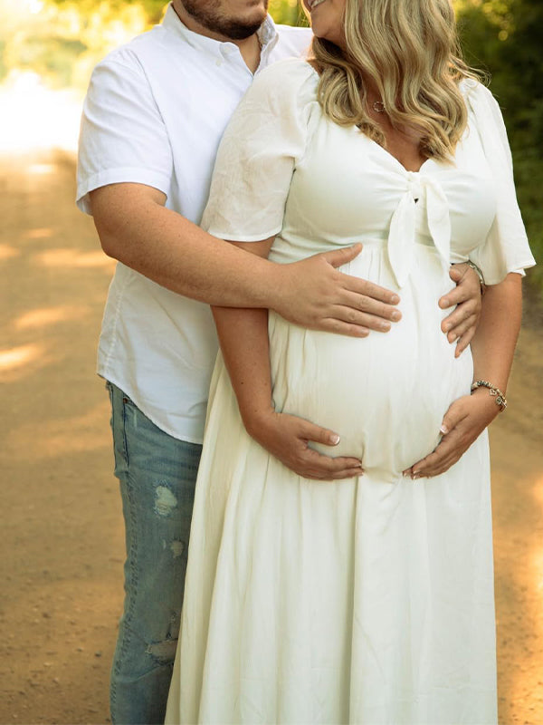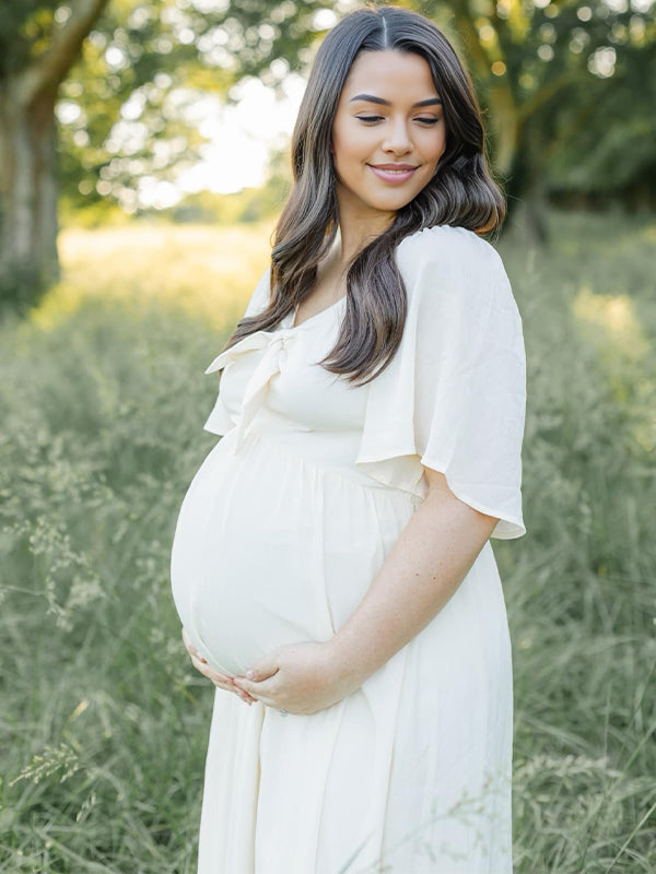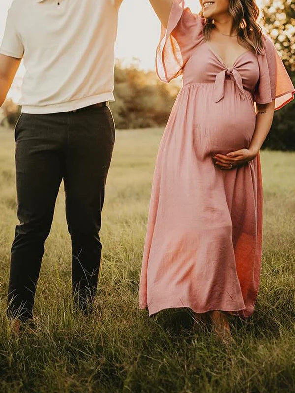 fotobeyou Bow Flutter Sleeve Solid V-neck Flowy Vacation Beach Cute Baby Shower Photoshoot Maternity Maxi Dress