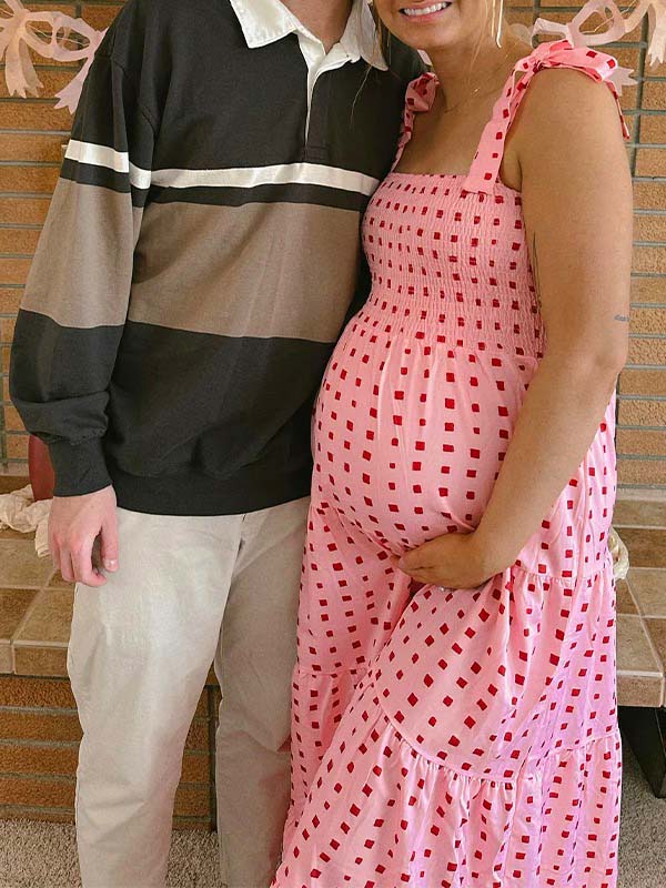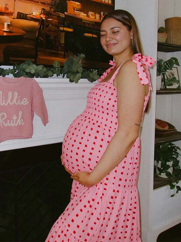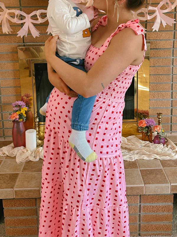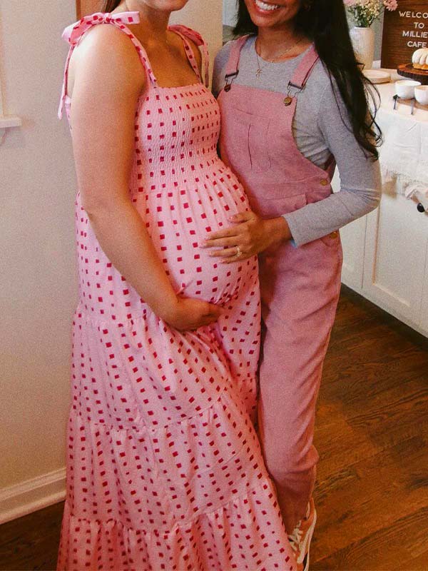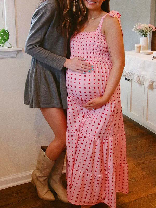 fotobeyou Bow Smocked Polka Dot Flowy Gender Reveal Baby Shower Maternity Maxi Dress