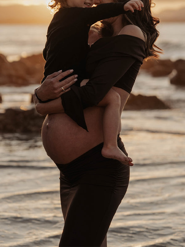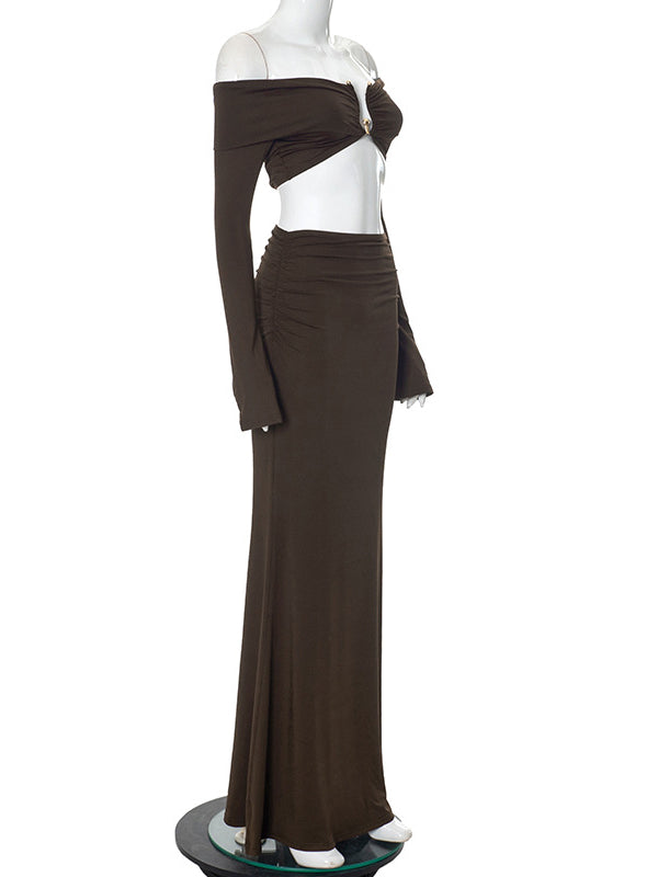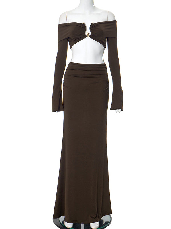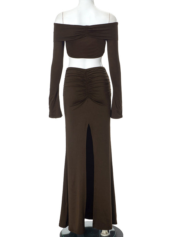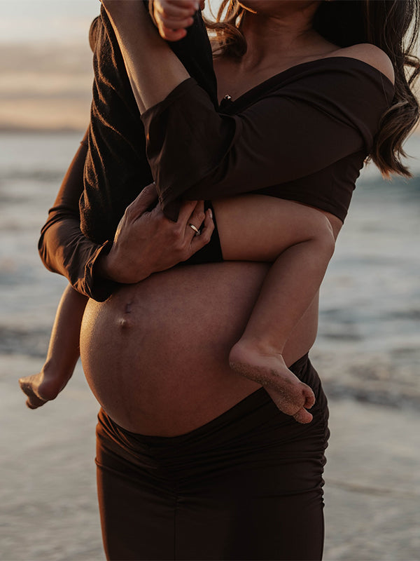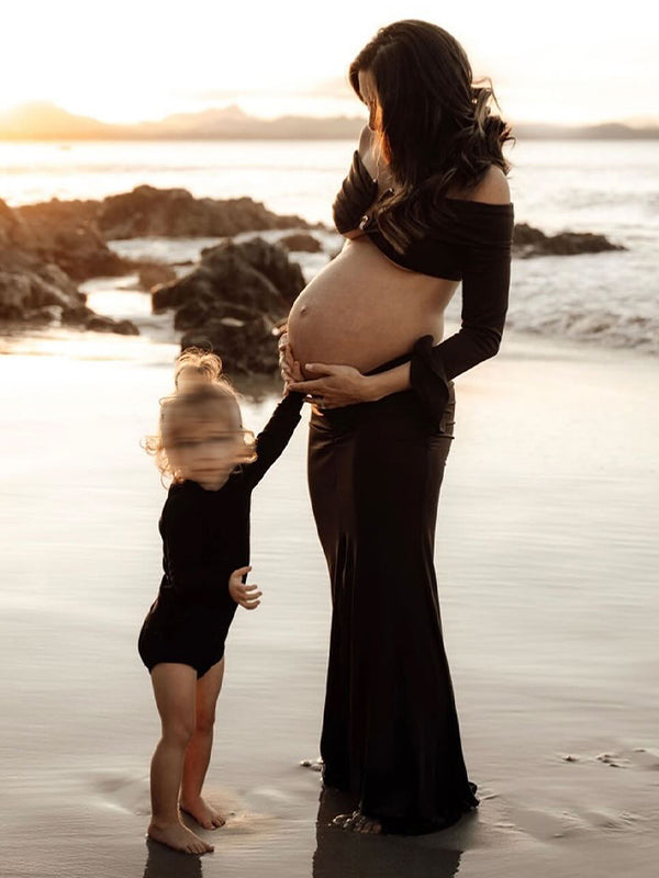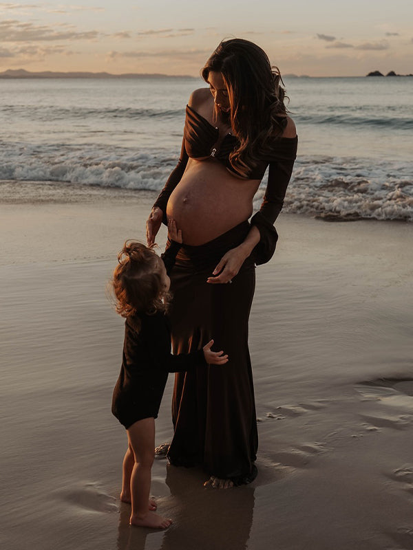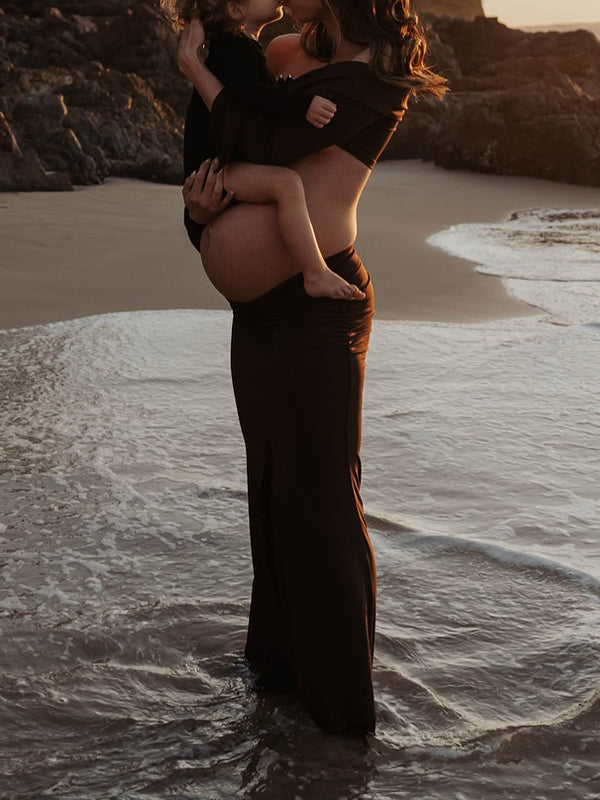 fotobeyou Brown 2-in-1 Off Shoulder Flare Sleeve Ruched Back Slit Bodycon Elegant Photoshoot Maternity Maxi Dress