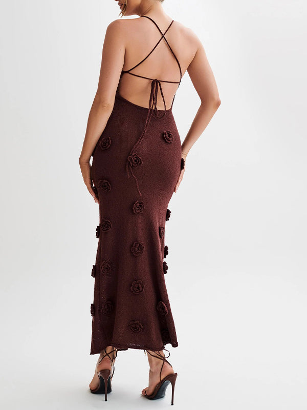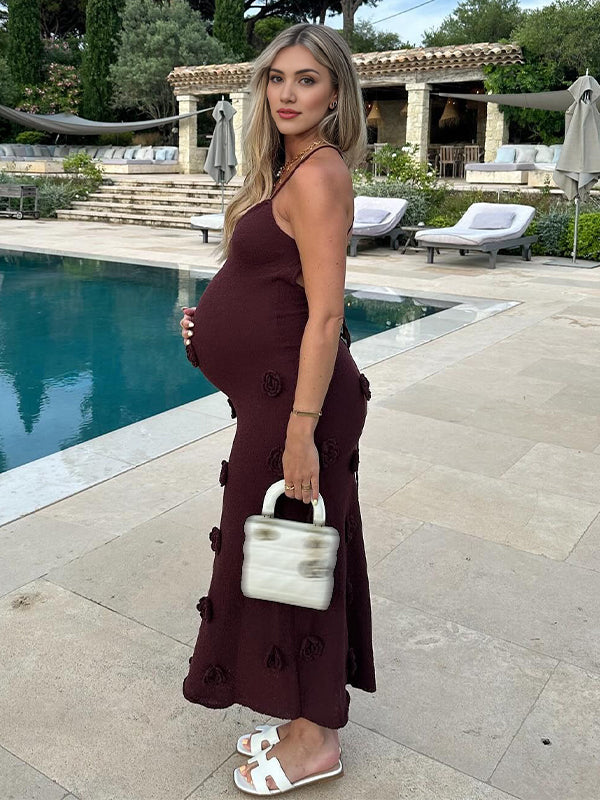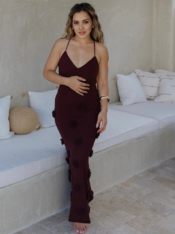 fotobeyou Brown Halter Neck Backless 3D Flowers Crochet Mermaid Bodycon Elegant Photoshoot Baby Shower Maternity Maxi Dress