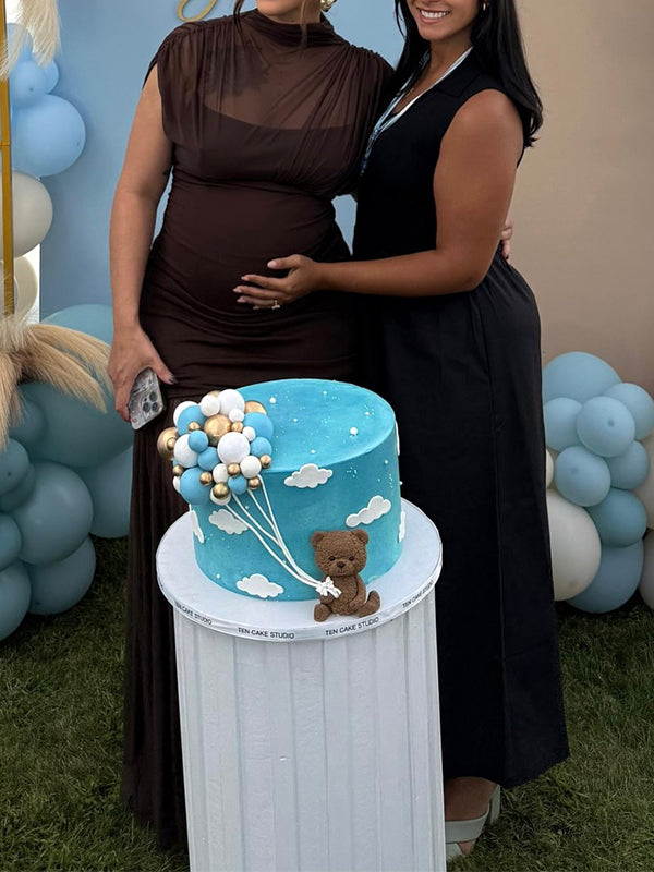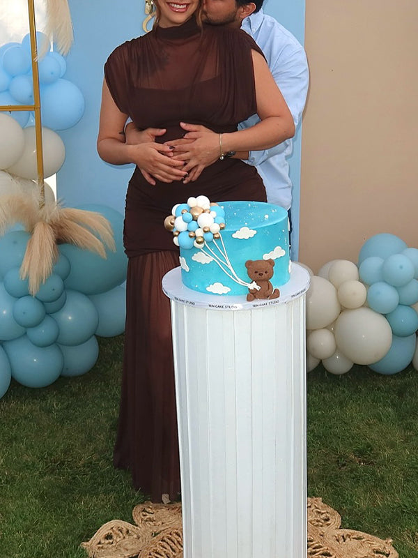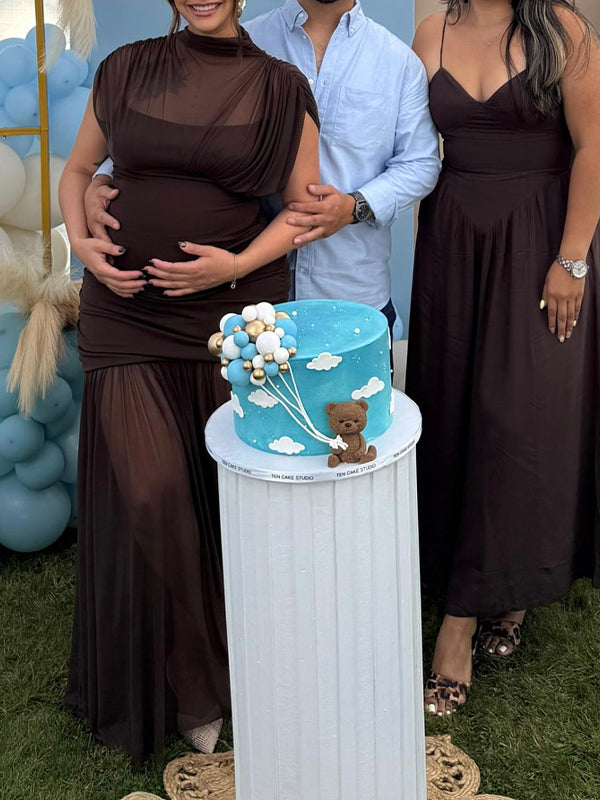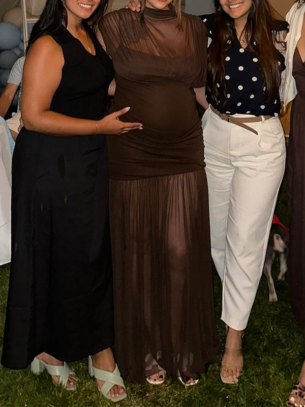 Fotobeyou Brown Ruched Pleated Grenadine Sheer Baby Shower Maternity Maxi Dress