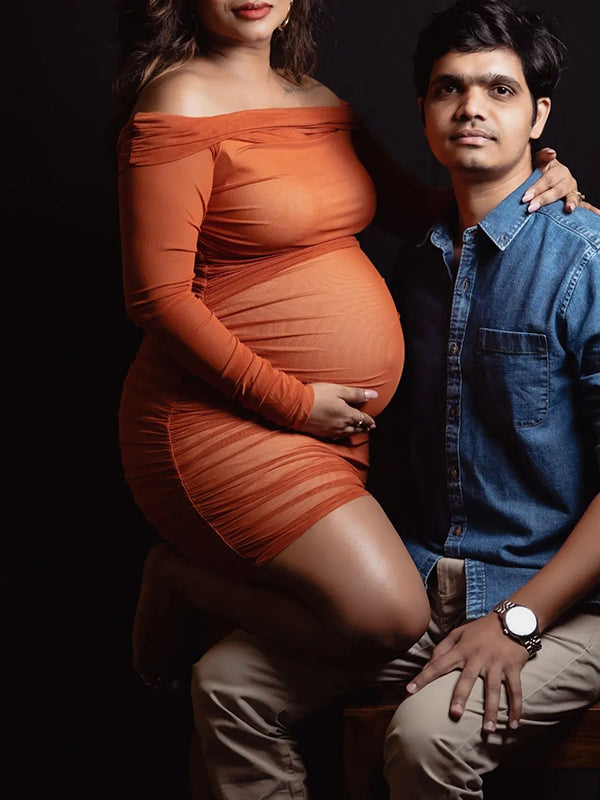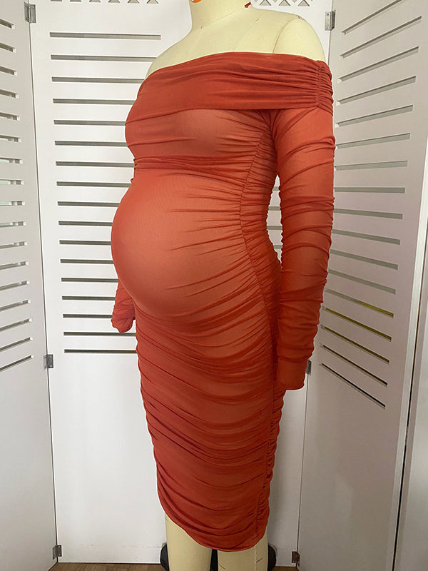 fotobeyou Caramel Off Shoulder Grenadine Ruched Elegant Baby Shower Maternity Midi Dress