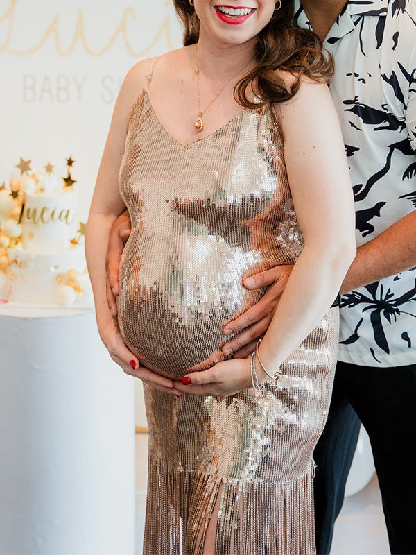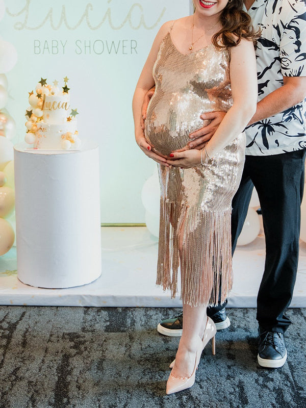 fotobeyou Champagne Sequin Tassel Backless Bodycon Cocktail Party Baby Shower Maternity Midi Dress