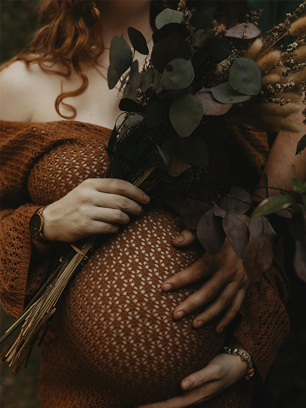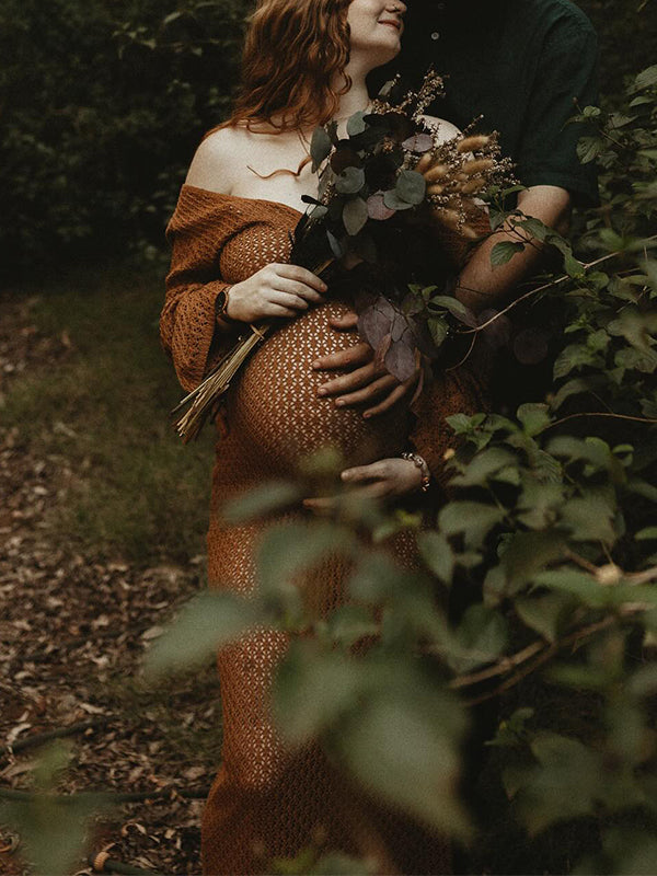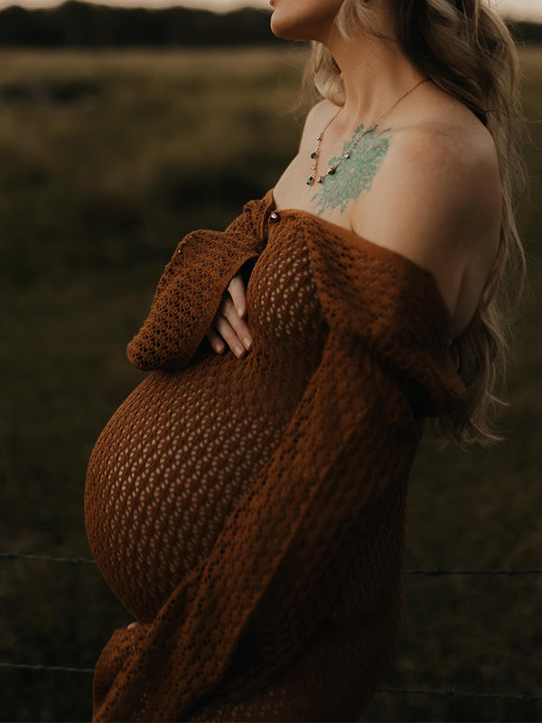 fotobeyou Coffee Color V-Neck Knitting Cut Out Beach Vacation Photoshoot Maternity Maxi Dress