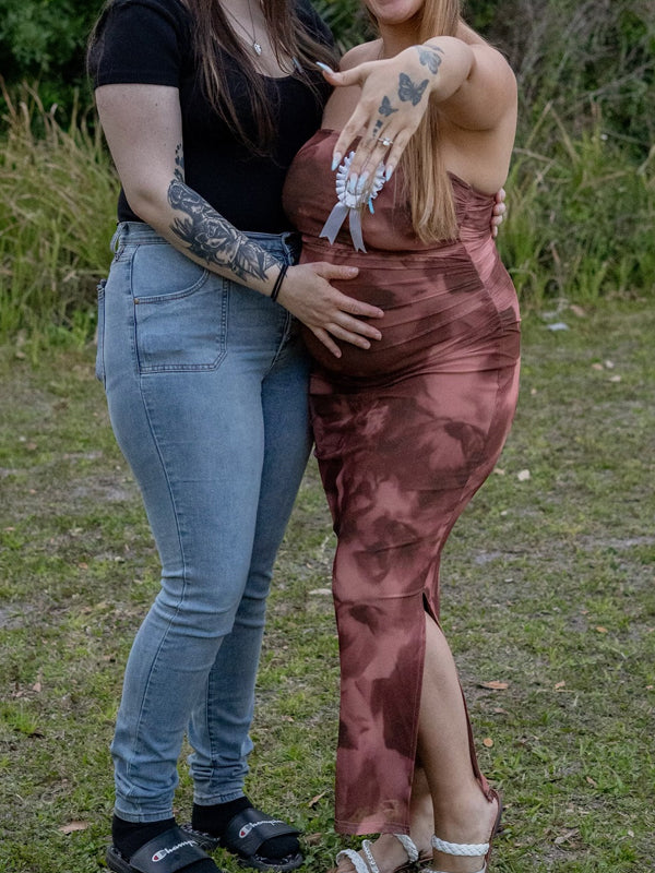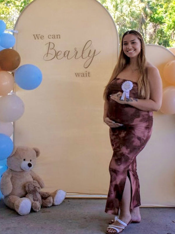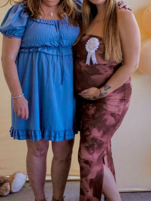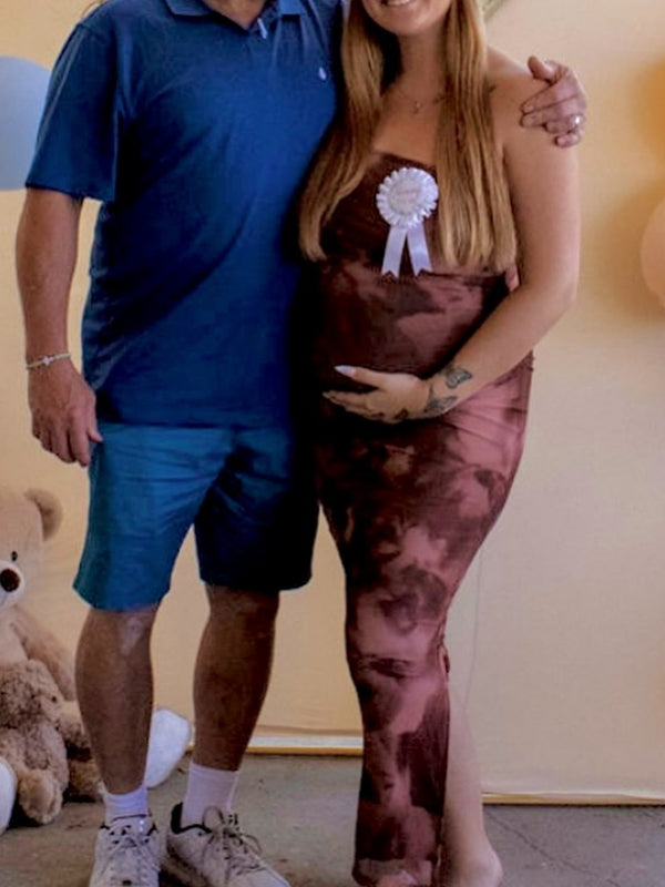 Fotobeyou Coffee Print Side Slit Grenadine Maternity Baby Shower Maxi Dress