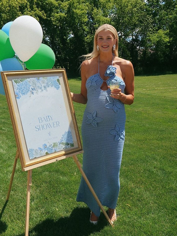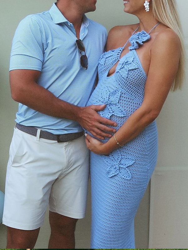 fotobeyou Crochet Hollow Out 3D Flowes Cut Out Halter Neck Cami Bodycon Elegant Baby Moon Beach Maternity Photoshoot Baby Shower Maxi Dress