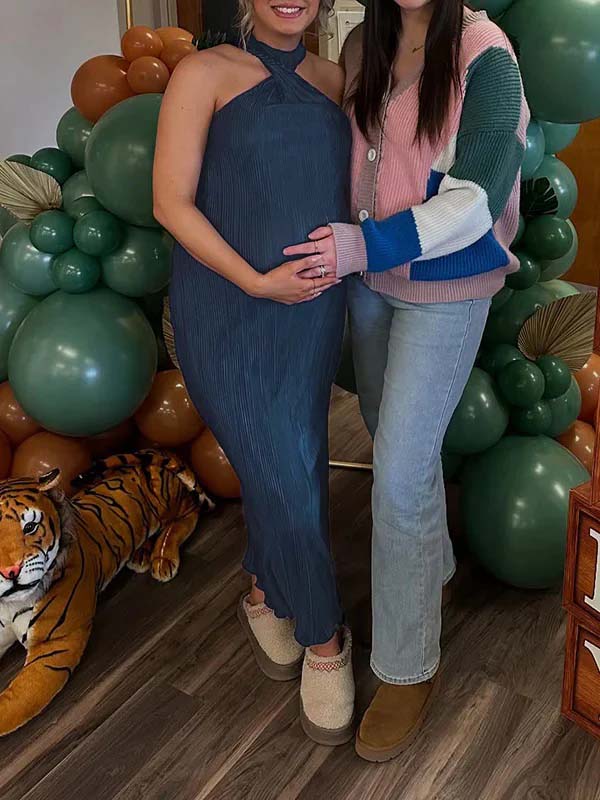 fotobeyou Dark Blue Halter Neck Off Shoulder Kink Side Slit Baby Shower Maternity Photoshoot Maxi Dress