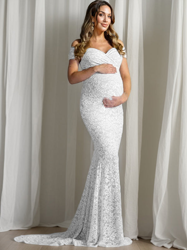 fotobeyou Floral Lace Off Shoulder Mermaid PhotoShoot Baby Shower Pregnant Maternity Maxi Dress