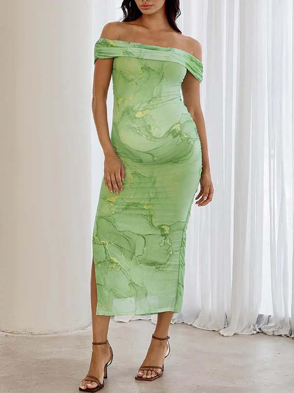 fotobeyou Floral Mesh Off Shoulder Ruched Side Slit Elegant Maternity Baby Shower Maxi Dress
