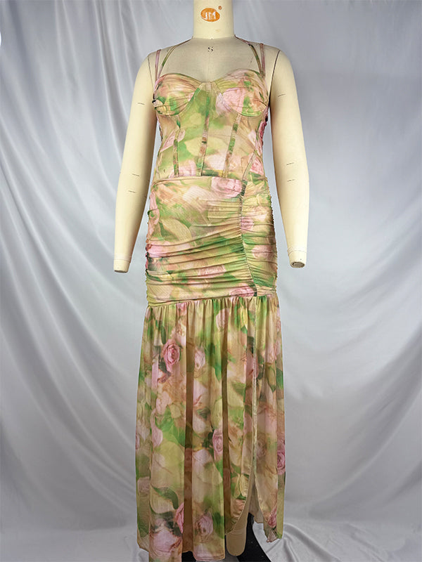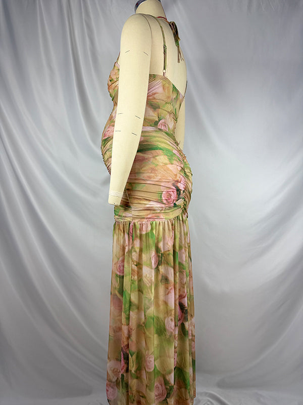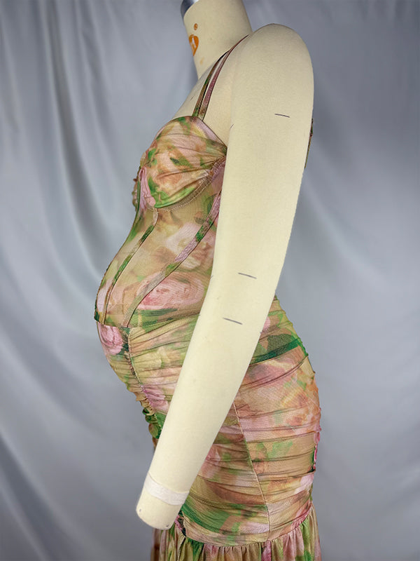 fotobeyou Floral Mesh Ruched Ruffle Boned Bodice Side Slit Cami Elegant Maternity Maxi Dress