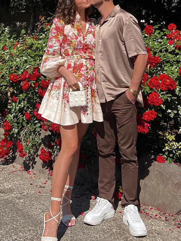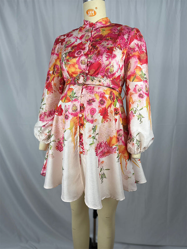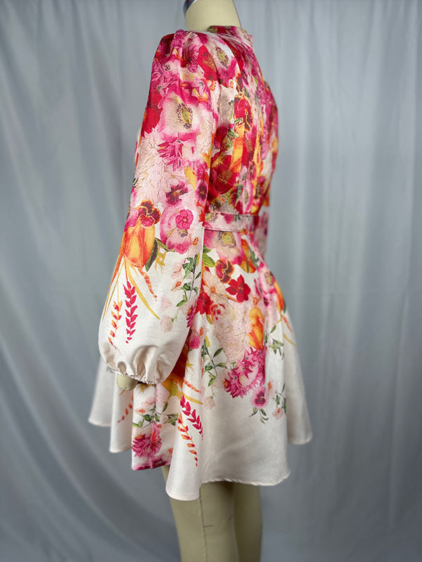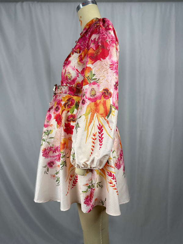 fotobeyou Floral Single Breasted Belt A-line Lantern Sleeve Elegant Maternity Baby Shower Mini Dress