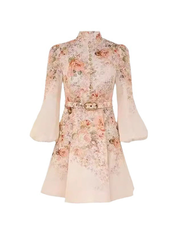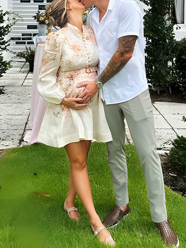 fotobeyou Floral Single Breasted Belt A-line Lantern Sleeve Sweet Maternity Baby Shower Mini Dress