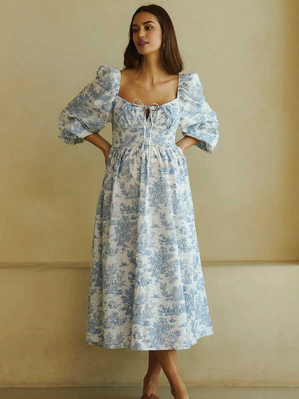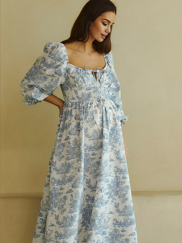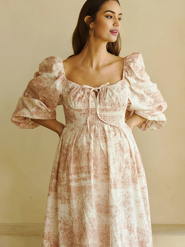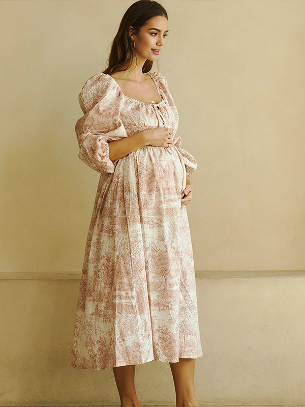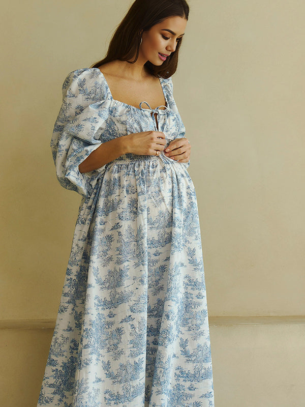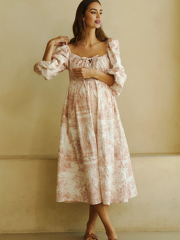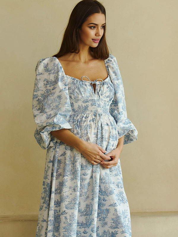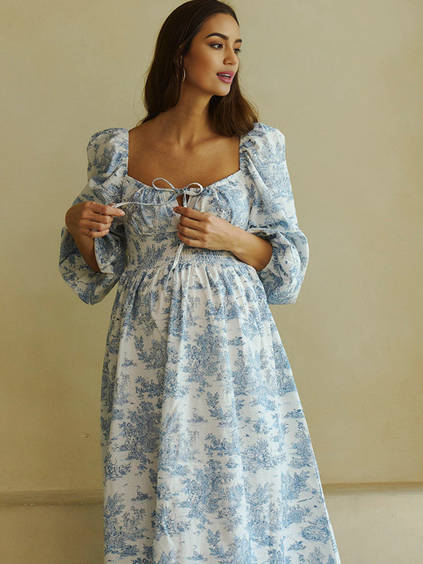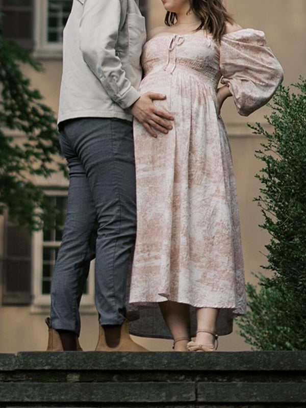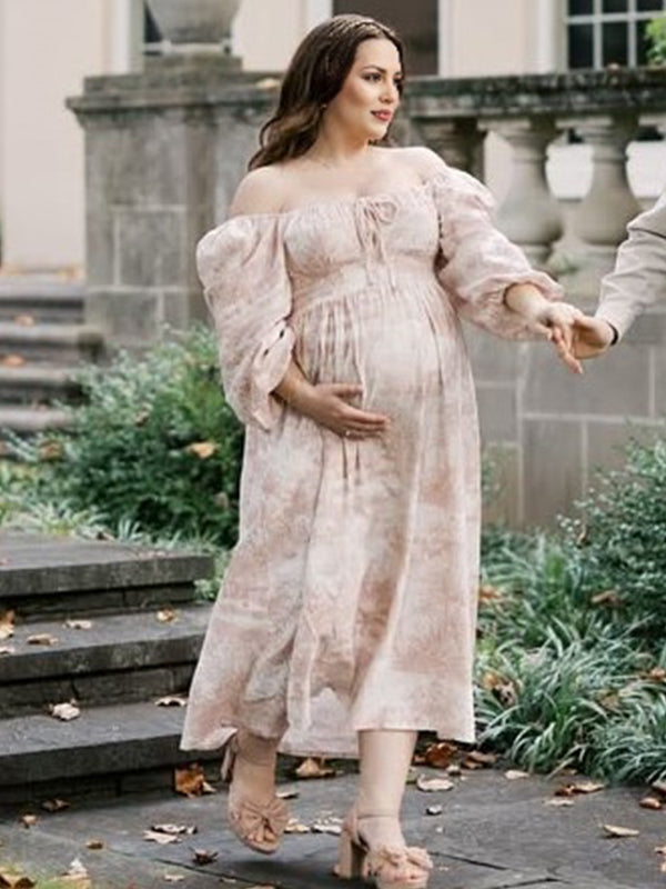 Fotobeyou Floral Smocked Lace-Up Off Shoulder A-line Maternity Maxi Dress