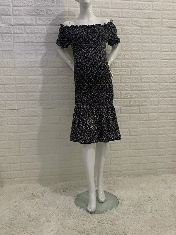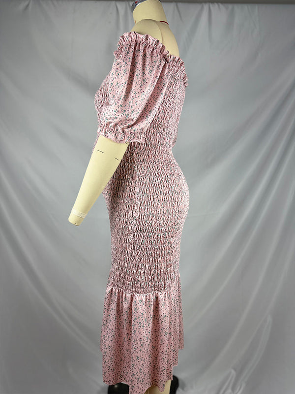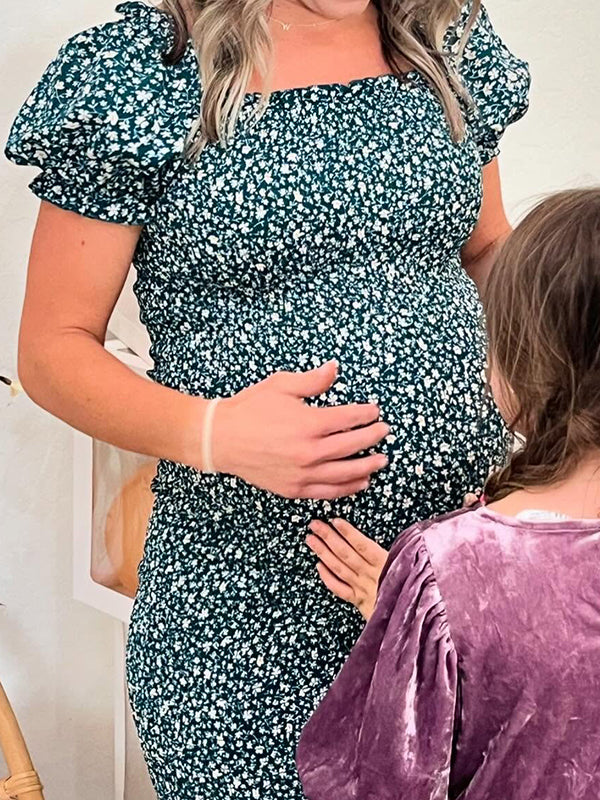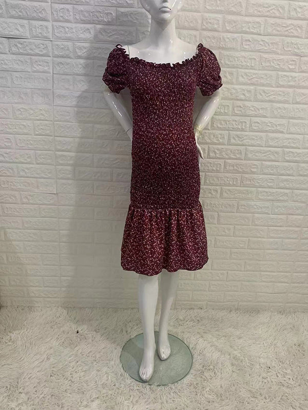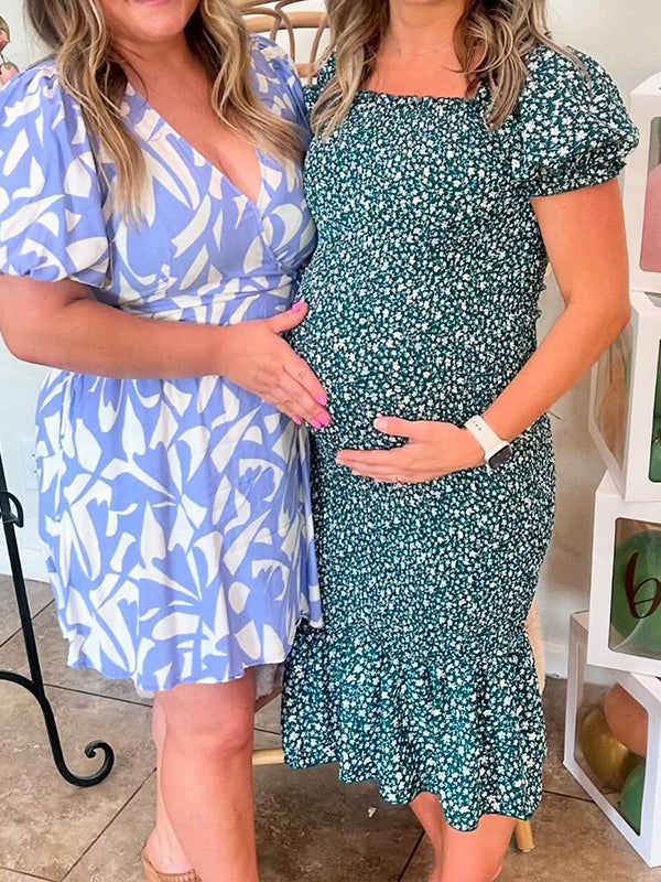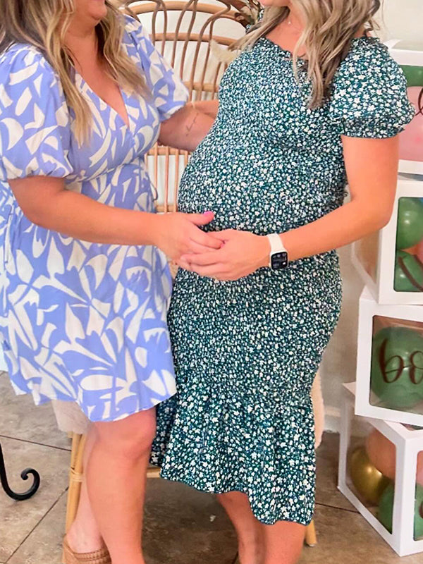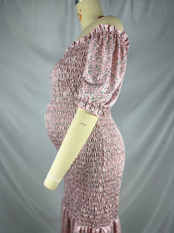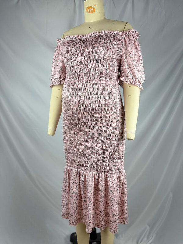 fotobeyou Floral Smocked Ruffle Falbala Mermaid Elegant Maternity Baby Shower Midi Dress