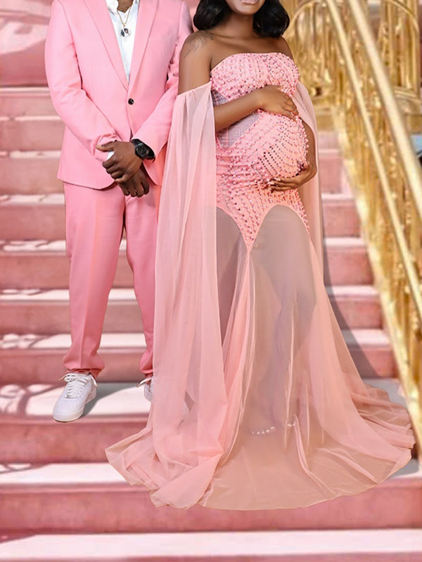 fotobeyou Flowy Off Shoulder Tulle Beading Pearls Rhinestone Bodice Mermaid Elegant Cocktail Evening Gown Luxury Sheer Maternity Baby Shower Maxi Dress